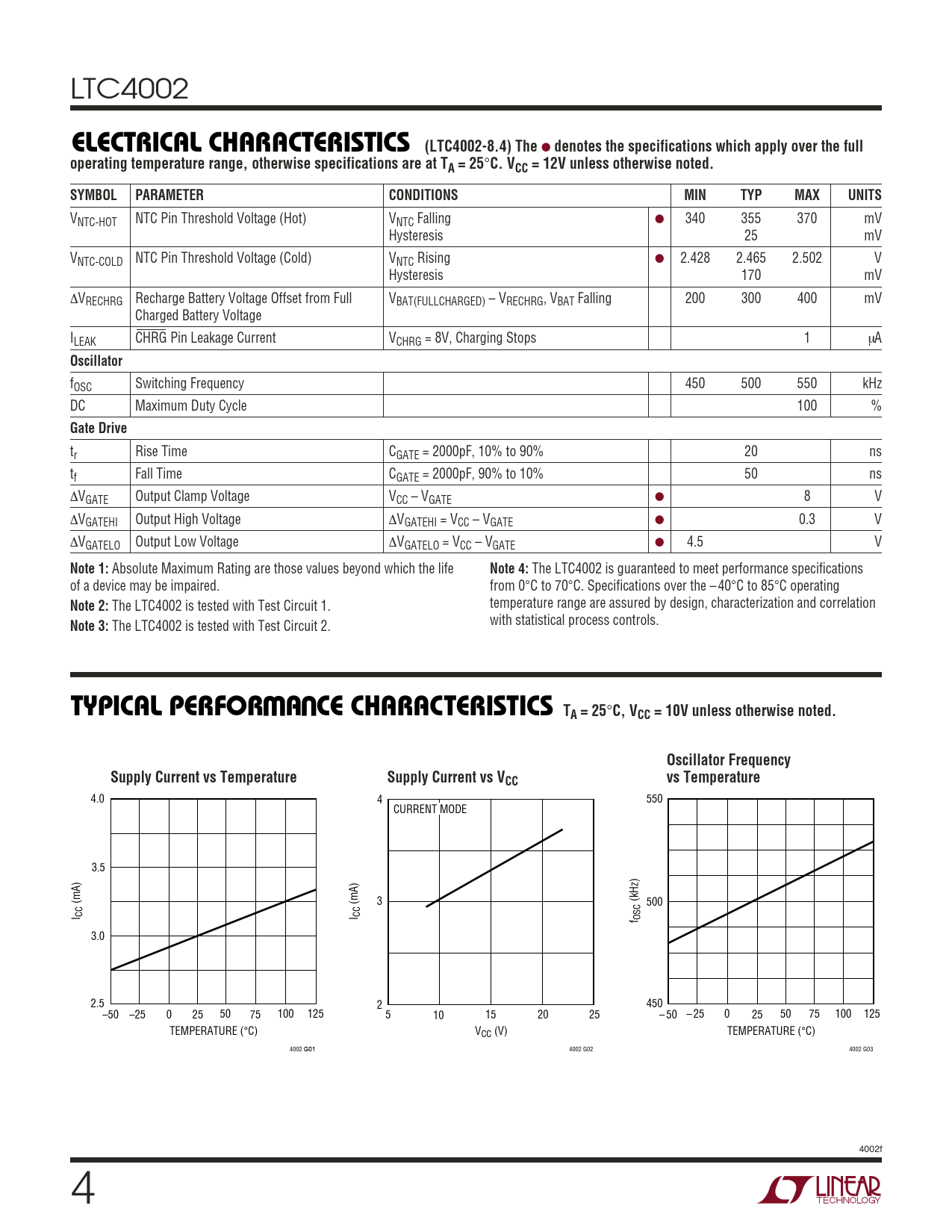 LTC4002 ELECTRICAL CHARACTERISTICS (LTC4002-8.4) The ● denotes the specifications which apply over the fulloperating temperature range, otherwise specifications are at TA = 25 ° C. VCC = 12V unless otherwise noted.SYMBOLPARAMETERCONDITIONSMINTYPMAXUNITS VNTC-HOT NTC Pin Threshold Voltage (Hot) VNTC Falling ● 340 355 370 mV Hysteresis 25 mV VNTC-COLD NTC Pin Threshold Voltage (Cold) VNTC Rising ● 2.428 2.465 2.502 V Hysteresis 170 mV ∆VRECHRG Recharge Battery Voltage Offset from Full VBAT(FULLCHARGED) – VRECHRG, VBAT Falling 200 300 400 mV Charged Battery Voltage ILEAK CHRG Pin Leakage Current VCHRG = 8V, Charging Stops 1 µA Oscillator fOSC Switching Frequency 450 500 550 kHz DC Maximum Duty Cycle 100 % Gate Drive tr Rise Time CGATE = 2000pF, 10% to 90% 20 ns tf Fall Time CGATE = 2000pF, 90% to 10% 50 ns ∆VGATE Output Clamp Voltage VCC – VGATE ● 8 V ∆VGATEHI Output High Voltage ∆VGATEHI = VCC – VGATE ● 0.3 V ∆VGATELO Output Low Voltage ∆VGATELO = VCC – VGATE ● 4.5 V Note 1: Absolute Maximum Rating are those values beyond which the life Note 4: The LTC4002 is guaranteed to meet performance specifications of a device may be impaired. from 0°C to 70°C. Specifications over the – 40°C to 85°C operating Note 2: The LTC4002 is tested with Test Circuit 1. temperature range are assured by design, characterization and correlation Note 3: The LTC4002 is tested with Test Circuit 2. with statistical process controls. WUTYPICAL PERFOR A CE CHARACTERISTICS TA = 25 ° C, VCC = 10V unless otherwise noted.Oscillator FrequencySupply Current vs TemperatureSupply Current vs VCCvs Temperature 4.0 4 550 CURRENT MODE 3.5 (mA) (mA) 3 (kHz) 500 I CC I CC f OSC 3.0 2.5 2 450 –50 –25 0 25 50 75 100 125 5 10 15 20 25 – 50 – 25 0 25 50 75 100 125 TEMPERATURE (°C) VCC (V) TEMPERATURE (°C) 4002 G01 4002 G02 4002 G03 4002f 4