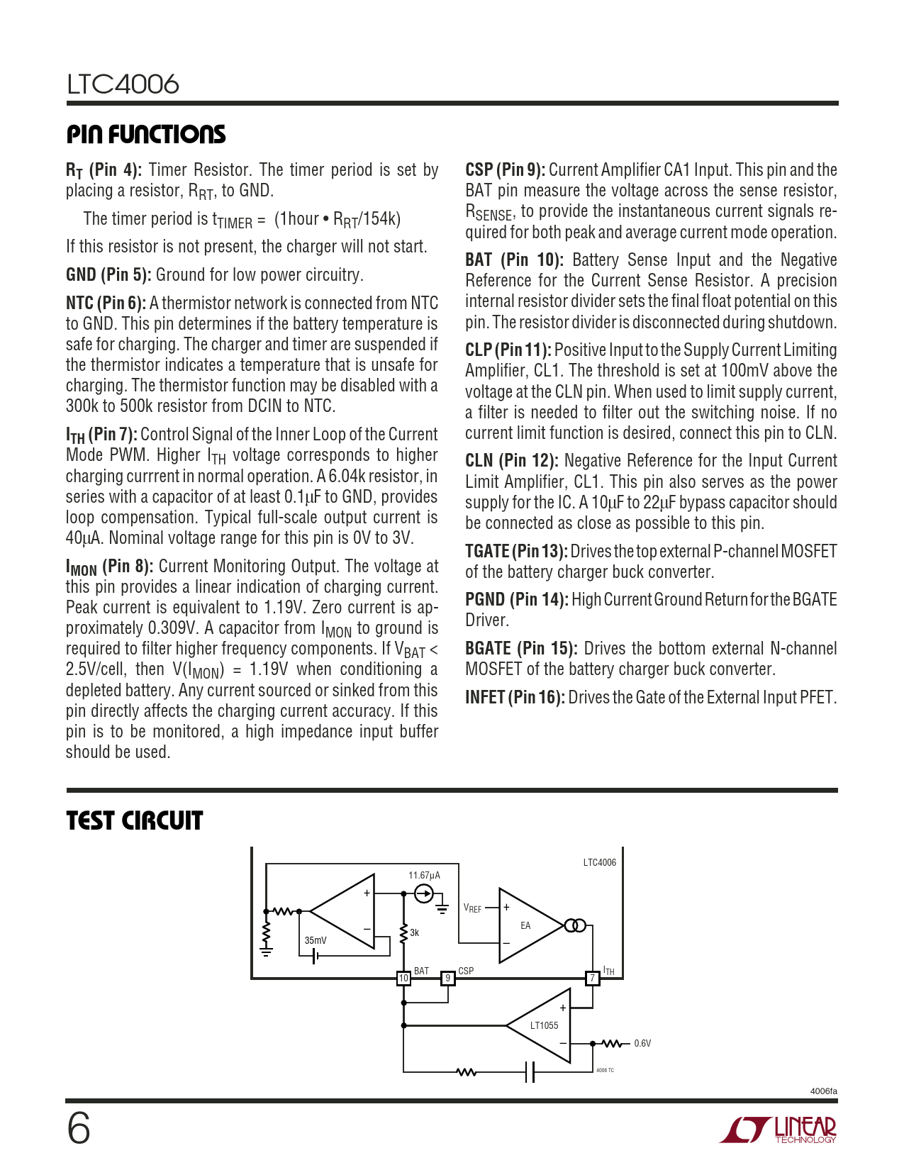 LTC4006 11.67µA + VREF + – EA 3k 35mV – BAT CSP ITH 10 9 7 + LT1055 – 0.6V 4006 TC 4006fa 6