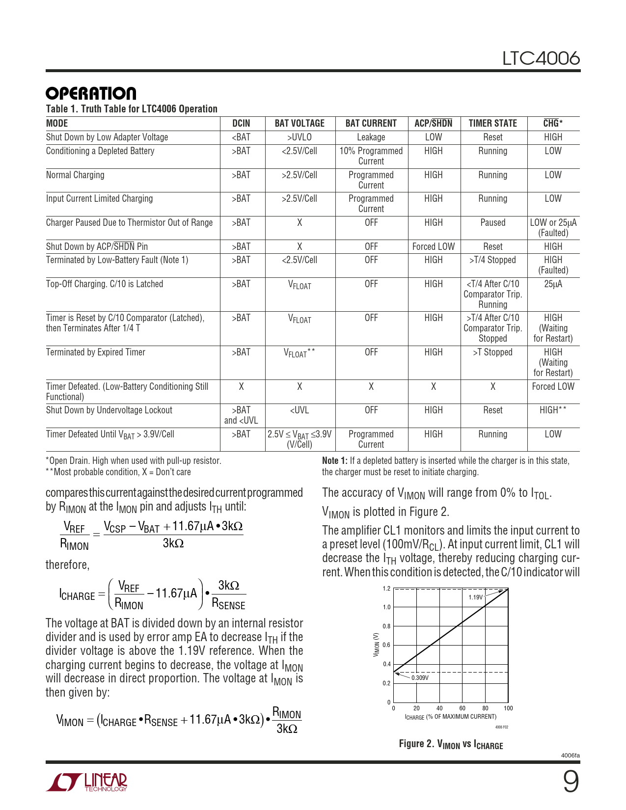 LTC4006 UOPERATIOTable 1. Truth Table for LTC4006 OperationMODEDCINBAT VOLTAGEBAT CURRENTACP/SHDNTIMER STATECHG* Shut Down by Low Adapter Voltage <BAT >UVLO Leakage LOW Reset HIGH Conditioning a Depleted Battery >BAT <2.5V/Cell 10% Programmed HIGH Running LOW Current Normal Charging >BAT >2.5V/Cell Programmed HIGH Running LOW Current Input Current Limited Charging >BAT >2.5V/Cell Programmed HIGH Running LOW Current Charger Paused Due to Thermistor Out of Range >BAT X OFF HIGH Paused LOW or 25µA (Faulted) Shut Down by ACP/SHDN Pin >BAT X OFF Forced LOW Reset HIGH Terminated by Low-Battery Fault (Note 1) >BAT <2.5V/Cell OFF HIGH >T/4 Stopped HIGH (Faulted) Top-Off Charging. C/10 is Latched >BAT VFLOAT OFF HIGH <T/4 After C/10 25µA Comparator Trip. Running Timer is Reset by C/10 Comparator (Latched), >BAT VFLOAT OFF HIGH >T/4 After C/10 HIGH then Terminates After 1/4 T Comparator Trip. (Waiting Stopped for Restart) Terminated by Expired Timer >BAT VFLOAT** OFF HIGH >T Stopped HIGH (Waiting for Restart) Timer Defeated. (Low-Battery Conditioning Still X X X X X Forced LOW Functional) Shut Down by Undervoltage Lockout >BAT <UVL OFF HIGH Reset HIGH** and <UVL Timer Defeated Until VBAT > 3.9V/Cell >BAT 2.5V ≤ VBAT ≤3.9V Programmed HIGH Running LOW (V/Cell) Current *Open Drain. High when used with pull-up resistor. Note 1: If a depleted battery is inserted while the charger is in this state, **Most probable condition, X = Don’t care the charger must be reset to initiate charging. compares this current against the desired current programmed The accuracy of VIMON will range from 0% to ITOL. by RIMON at the IMON pin and adjusts ITH until: VIMON is plotted in Figure 2. V V – V . 11 67 A • k REF CSP BAT = + µ 3 Ω The amplifier CL1 monitors and limits the input current to R k IMON 3 Ω a preset level (100mV/RCL). At input current limit, CL1 will decrease the I therefore, TH voltage, thereby reducing charging cur- rent. When this condition is detected, the C/10 indicator will ⎛ V ⎞ k 3 Ω I REF = – . 11 67 A 1.2 CHARGE µ • ⎝⎜R ⎠⎟ R 1.19V IMON SENSE 1.0 The voltage at BAT is divided down by an internal resistor 0.8 divider and is used by error amp EA to decrease ITH if the (V) 0.6 divider voltage is above the 1.19V reference. When the IMONV charging current begins to decrease, the voltage at IMON 0.4 will decrease in direct proportion. The voltage at IMON is 0.309V 0.2 then given by: 0 R 0 20 40 60 80 100 V = I( •R + 11.67 A µ • k IMON 3 ) ICHARGE (% OF MAXIMUM CURRENT) IMON CHARGE SENSE Ω • k3Ω 4006 F02 Figure 2. VIMON vs ICHARGE 4006fa 9