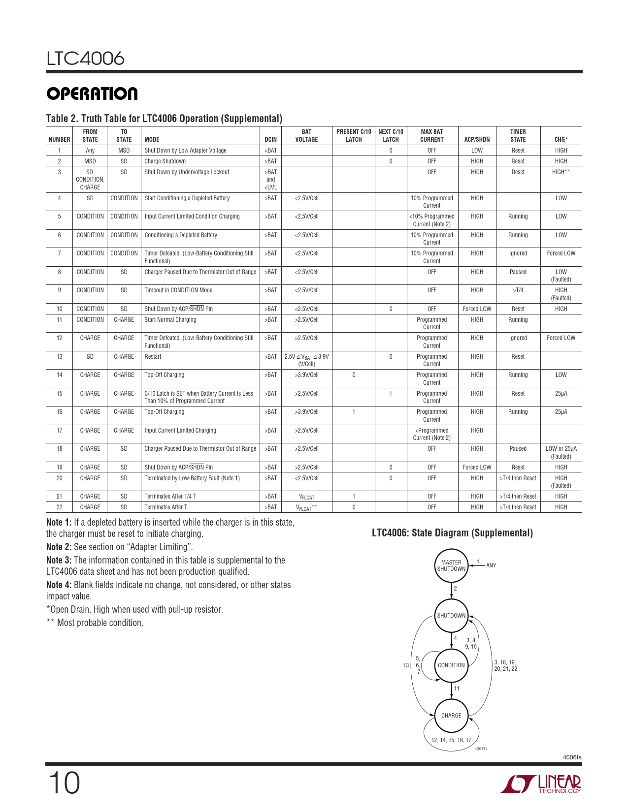 LTC4006 UOPERATIOTable 2. Truth Table for LTC4006 Operation (Supplemental)FROMTOBATPRESENT C/10NEXT C/10MAX BATTIMERNUMBERSTATESTATEMODEDCINVOLTAGELATCHLATCHCURRENTACP/SHDNSTATECHG* 1 Any MSD Shut Down by Low Adapter Voltage <BAT 0 OFF LOW Reset HIGH 2 MSD SD Charge Shutdown >BAT 0 OFF HIGH Reset HIGH 3 SD, SD Shut Down by Undervoltage Lockout >BAT OFF HIGH Reset HIGH** CONDITION, and CHARGE <UVL 4 SD CONDITION Start Conditioning a Depleted Battery >BAT <2.5V/Cell 10% Programmed HIGH LOW Current 5 CONDITION CONDITION Input Current Limited Condition Charging >BAT <2.5V/Cell <10% Programmed HIGH Running LOW Current (Note 2) 6 CONDITION CONDITION Conditioning a Depleted Battery >BAT <2.5V/Cell 10% Programmed HIGH Running LOW Current 7 CONDITION CONDITION Timer Defeated. (Low-Battery Conditioning Still >BAT <2.5V/Cell 10% Programmed HIGH Ignored Forced LOW Functional) Current 8 CONDITION SD Charger Paused Due to Thermistor Out of Range >BAT <2.5V/Cell OFF HIGH Paused LOW (Faulted) 9 CONDITION SD Timeout in CONDITION Mode >BAT <2.5V/Cell OFF HIGH >T/4 HIGH (Faulted) 10 CONDITION SD Shut Down by ACP/SHDN Pin >BAT <2.5V/Cell 0 OFF Forced LOW Reset HIGH 11 CONDITION CHARGE Start Normal Charging >BAT >2.5V/Cell Programmed HIGH Running Current 12 CHARGE CHARGE Timer Defeated. (Low-Battery Conditioning Still >BAT >2.5V/Cell Programmed HIGH Ignored Forced LOW Functional) Current 13 SD CHARGE Restart >BAT 2.5V ≤ VBAT ≤ 3.9V 0 Programmed HIGH Reset (V/Cell) Current 14 CHARGE CHARGE Top-Off Charging >BAT >3.9V/Cell 0 Programmed HIGH Running LOW Current 15 CHARGE CHARGE C/10 Latch is SET when Battery Current is Less >BAT >2.5V/Cell 1 Programmed HIGH Reset 25µA Than 10% of Programmed Current Current 16 CHARGE CHARGE Top-Off Charging >BAT >3.9V/Cell 1 Programmed HIGH Running 25µA Current 17 CHARGE CHARGE Input Current Limited Charging >BAT >2.5V/Cell <Programmed HIGH Current (Note 2) 18 CHARGE SD Charger Paused Due to Thermistor Out of Range >BAT >2.5V/Cell OFF HIGH Paused LOW or 25µA (Faulted) 19 CHARGE SD Shut Down by ACP/SHDN Pin >BAT >2.5V/Cell 0 OFF Forced LOW Reset HIGH 20 CHARGE SD Terminated by Low-Battery Fault (Note 1) >BAT <2.5V/Cell 0 OFF HIGH >T/4 then Reset HIGH (Faulted) 21 CHARGE SD Terminates After 1/4 T >BAT VFLOAT 1 OFF HIGH >T/4 then Reset HIGH 22 CHARGE SD Terminates After T >BAT VFLOAT** 0 OFF HIGH >T/4 then Reset HIGH Note 1: If a depleted battery is inserted while the charger is in this state, the charger must be reset to initiate charging. LTC4006: State Diagram (Supplemental)Note 2: See section on “Adapter Limiting”. Note 3: The information contained in this table is supplemental to the MASTER 1 ANY LTC4006 data sheet and has not been production qualified. SHUTDOWN Note 4: Blank fields indicate no change, not considered, or other states 2 impact value. *Open Drain. High when used with pull-up resistor. SHUTDOWN ** Most probable condition. 4 3, 8, 9, 10 5, 3, 18, 19, 13 6, CONDITION 20, 21, 22 7 11 CHARGE 12, 14, 15, 16, 17 4006 F15 4006fa 10