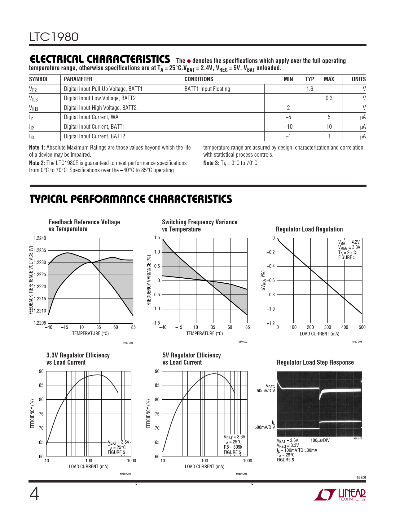 1.2240 1.5 0 VBAT = 4.2V V 1.2235 REG ≅ 3.3V 1.0 –0.2 TA = 25°C FIGURE 5 1.2230 0.5 –0.4 1.2225 (%) 0 –0.6 REG 1.2220 V ∆ –0.5 –0.8 1.2215 FREQUENCY VARIANCE (%) –1.0 –1.0 FEEDBACK REFERENCE VOLTAGE (V) 1.2210 1.2205 –1.5 –1.2 –40 –15 10 35 60 85 –40 –15 10 35 60 85 0 100 200 300 400 500 TEMPERATURE (°C) TEMPERATURE (°C) LOAD CURRENT (mA) 1980 G01 1980 G02 1980 G03