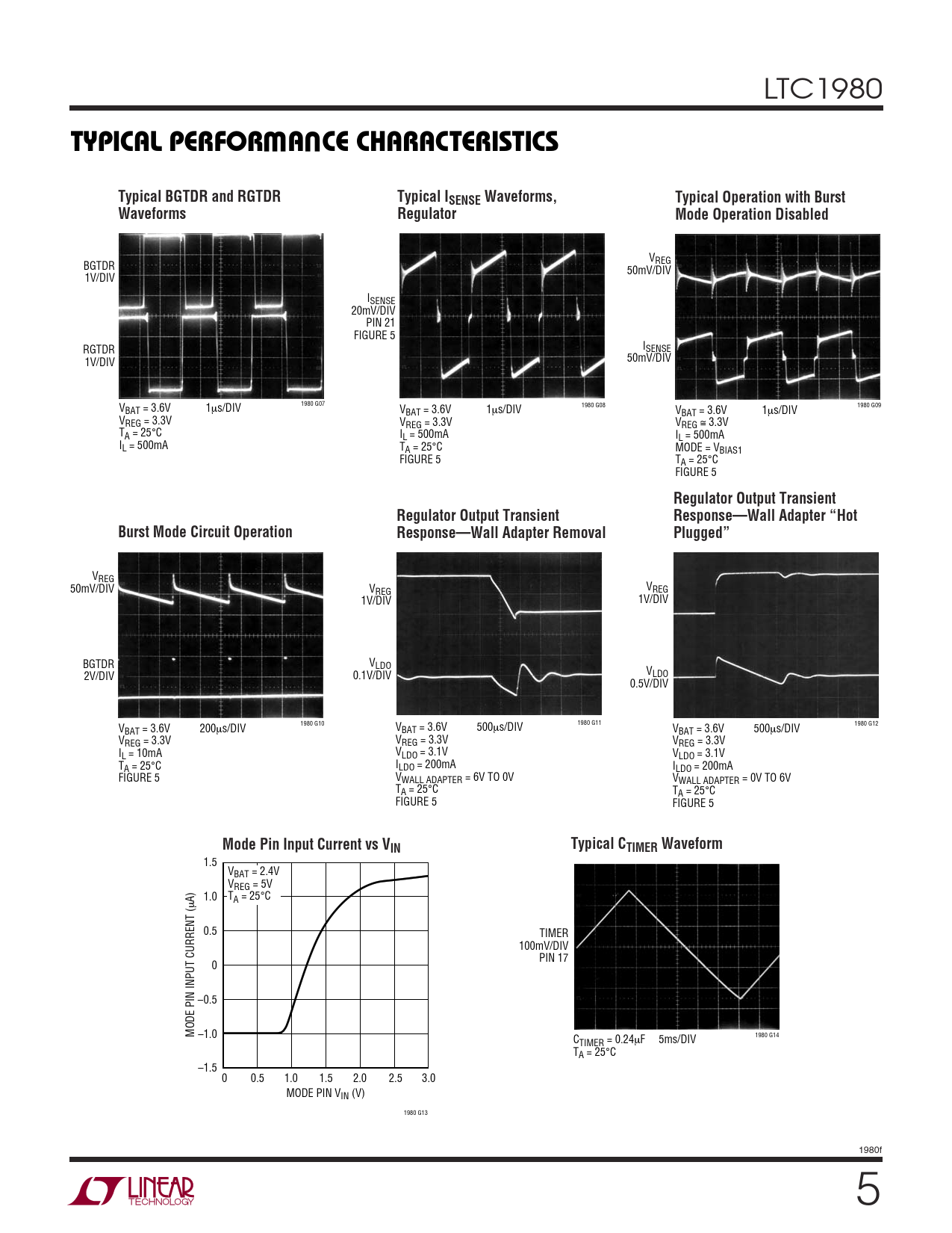 1.5 VBAT = 2.4V VREG = 5V A) 1.0 TA = 25°C µ 0.5 TIMER 100mV/DIV PIN 17 0 –0.5 MODE PIN INPUT CURRENT ( –1.0 C 5ms/DIV 1980 G14 TIMER = 0.24µF TA = 25°C –1.5 0 0.5 1.0 1.5 2.0 2.5 3.0 MODE PIN VIN (V) 1980 G13 1980f 5