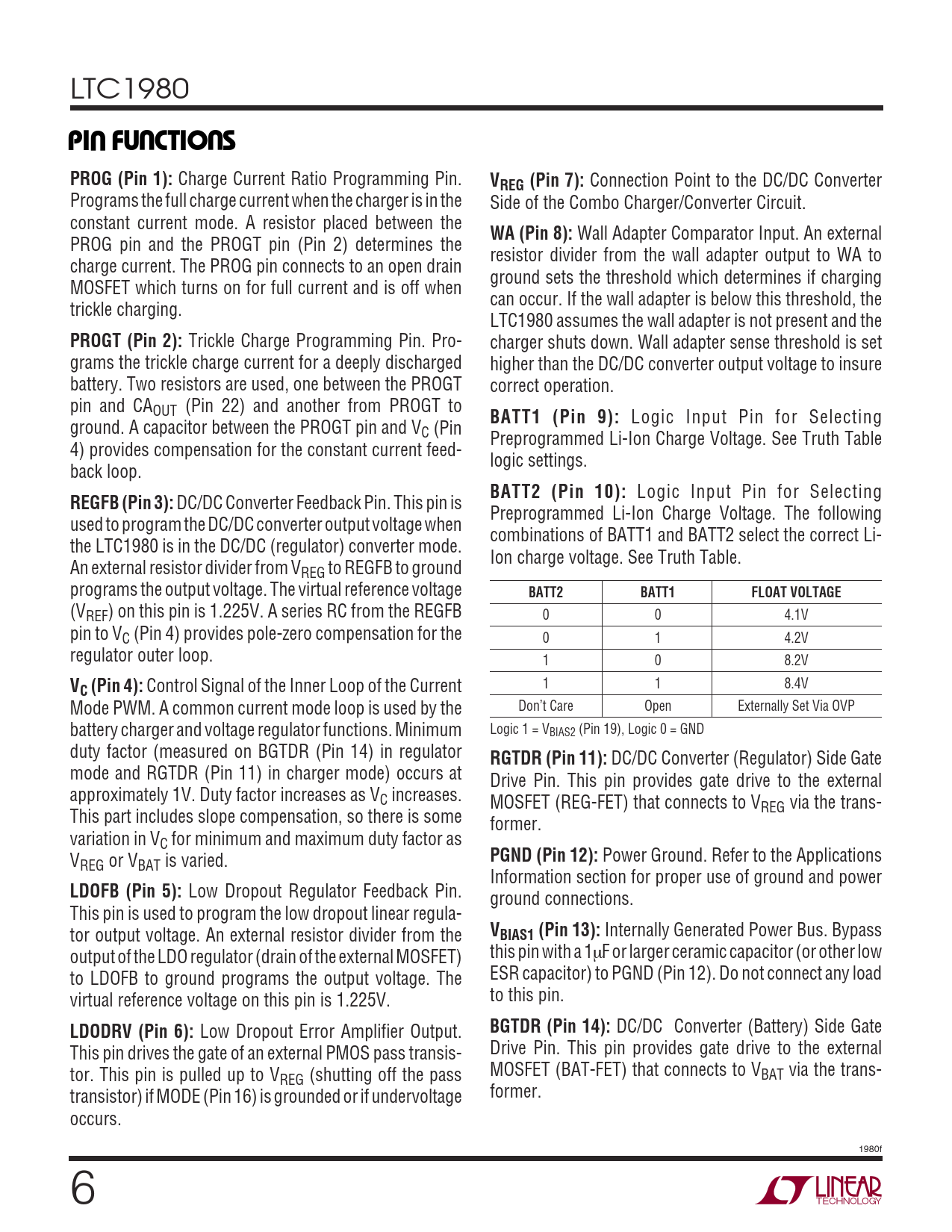 DC/DC Converter Feedback Pin. This pin is Preprogrammed Li-Ion Charge Voltage. The following used to program the DC/DC converter output voltage when combinations of BATT1 and BATT2 select the correct Li- the LTC1980 is in the DC/DC (regulator) converter mode. Ion charge voltage. See Truth Table. An external resistor divider from VREG to REGFB to ground programs the output voltage. The virtual reference voltage