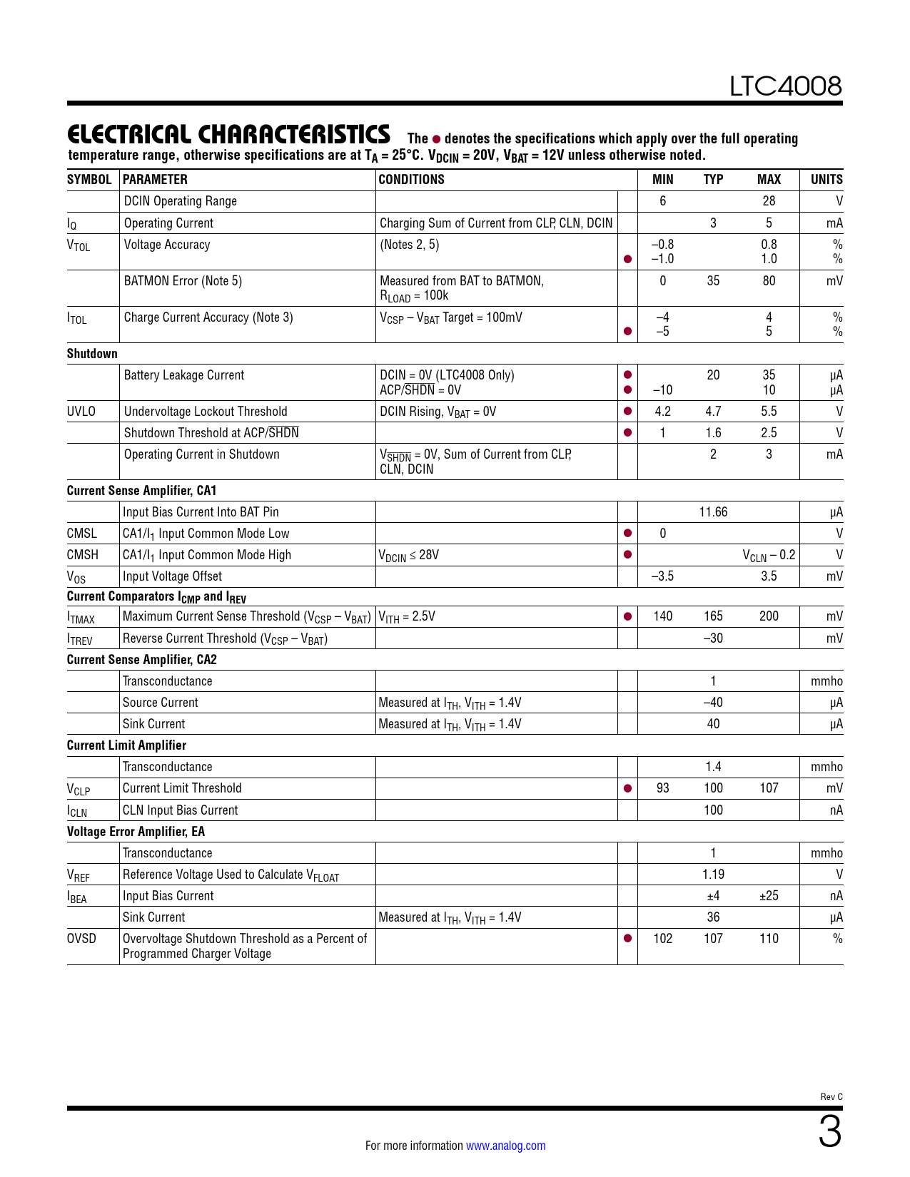LTC4008 ELECTRICAL CHARACTERISTICSThe l denotes the specifications which apply over the full operatingtemperature range, otherwise specifications are at TA = 25°C. VDCIN = 20V, VBAT = 12V unless otherwise noted.SYMBOL PARAMETERCONDITIONSMINTYPMAXUNITS DCIN Operating Range 6 28 V IQ Operating Current Charging Sum of Current from CLP, CLN, DCIN 3 5 mA VTOL Voltage Accuracy (Notes 2, 5) –0.8 0.8 % l –1.0 1.0 % BATMON Error (Note 5) Measured from BAT to BATMON, 0 35 80 mV RLOAD = 100k ITOL Charge Current Accuracy (Note 3) VCSP – VBAT Target = 100mV –4 4 % l –5 5 % Shutdown Battery Leakage Current DCIN = 0V (LTC4008 Only) l 20 35 µA ACP/SHDN = 0V l –10 10 µA UVLO Undervoltage Lockout Threshold DCIN Rising, VBAT = 0V l 4.2 4.7 5.5 V Shutdown Threshold at ACP/SHDN l 1 1.6 2.5 V Operating Current in Shutdown VSHDN = 0V, Sum of Current from CLP, 2 3 mA CLN, DCIN Current Sense Amplifier, CA1 Input Bias Current Into BAT Pin 11.66 µA CMSL CA1/I1 Input Common Mode Low l 0 V CMSH CA1/I1 Input Common Mode High VDCIN ≤ 28V l VCLN – 0.2 V VOS Input Voltage Offset –3.5 3.5 mV Current Comparators ICMP and IREV ITMAX Maximum Current Sense Threshold (VCSP – VBAT) VITH = 2.5V l 140 165 200 mV ITREV Reverse Current Threshold (VCSP – VBAT) –30 mV Current Sense Amplifier, CA2 Transconductance 1 mmho Source Current Measured at ITH, VITH = 1.4V –40 µA Sink Current Measured at ITH, VITH = 1.4V 40 µA Current Limit Amplifier Transconductance 1.4 mmho VCLP Current Limit Threshold l 93 100 107 mV ICLN CLN Input Bias Current 100 nA Voltage Error Amplifier, EA Transconductance 1 mmho VREF Reference Voltage Used to Calculate VFLOAT 1.19 V IBEA Input Bias Current ±4 ±25 nA Sink Current Measured at ITH, VITH = 1.4V 36 µA OVSD Overvoltage Shutdown Threshold as a Percent of l 102 107 110 % Programmed Charger Voltage Rev C For more information www.analog.com 3 Document Outline Description Typical Application Absolute Maximum Ratings Typical Performance Characteristics Pin Functions Block Diagram Operation Applications Information Package Description Typical Application Related Parts Features Applications Typical Application Description Absolute Maximum Ratings Pin Configuration Order Information Electrical Characteristics Typical Performance Characteristics Pin Functions Block Diagram Test Circuit Operation Applications Information Package Description Revision History Related Parts
