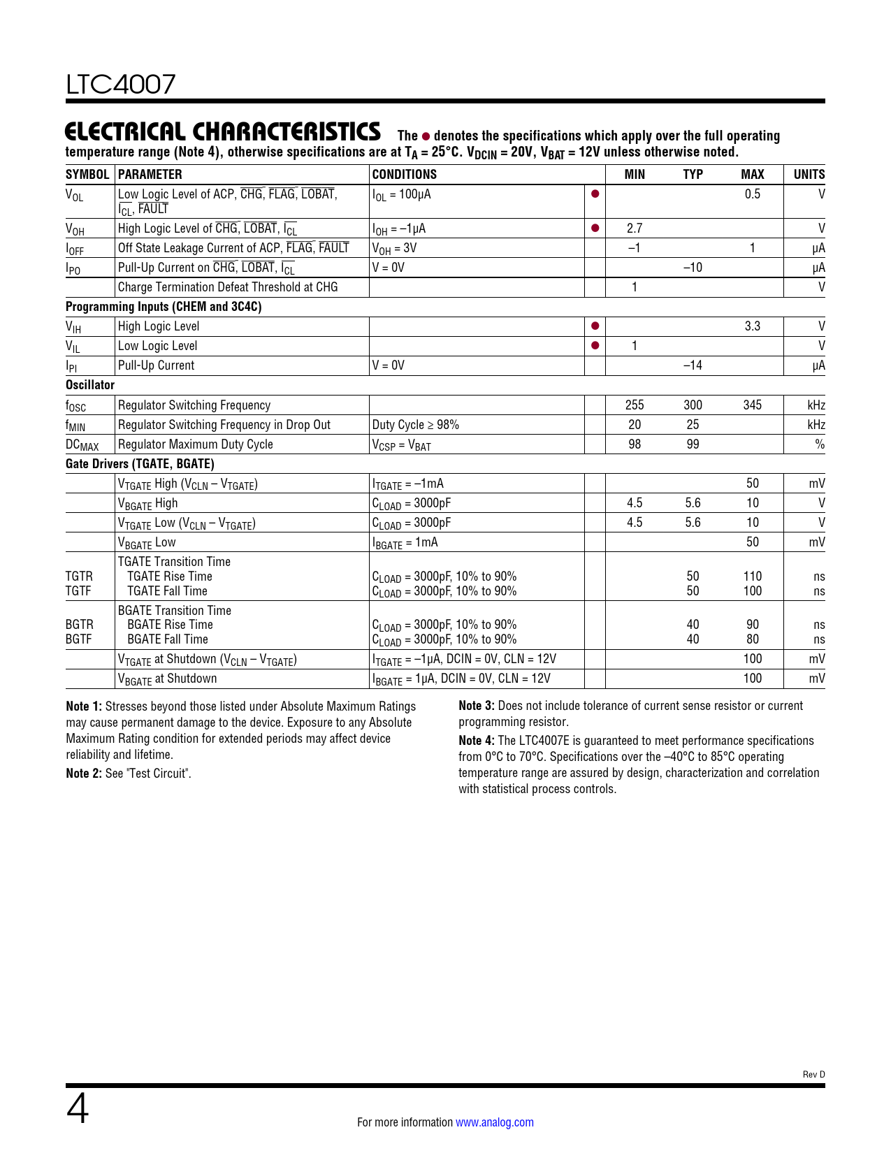 link to page 9 LTC4007 ELECTRICAL CHARACTERISTICSThe l denotes the specifications which apply over the full operatingtemperature range (Note 4), otherwise specifications are at TA = 25°C. VDCIN = 20V, VBAT = 12V unless otherwise noted. SYMBOL PARAMETERCONDITIONSMINTYPMAXUNITS VOL Low Logic Level of ACP, CHG, FLAG, LOBAT, IOL = 100µA l 0.5 V ICL, FAULT VOH High Logic Level of CHG, LOBAT, ICL IOH = –1µA l 2.7 V IOFF Off State Leakage Current of ACP, FLAG, FAULT VOH = 3V –1 1 µA IPO Pull-Up Current on CHG, LOBAT, ICL V = 0V –10 µA Charge Termination Defeat Threshold at CHG 1 V Programming Inputs (CHEM and 3C4C) VIH High Logic Level l 3.3 V VIL Low Logic Level l 1 V IPI Pull-Up Current V = 0V –14 µA Oscillator fOSC Regulator Switching Frequency 255 300 345 kHz fMIN Regulator Switching Frequency in Drop Out Duty Cycle ≥ 98% 20 25 kHz DCMAX Regulator Maximum Duty Cycle VCSP = VBAT 98 99 % Gate Drivers (TGATE, BGATE) VTGATE High (VCLN – VTGATE) ITGATE = –1mA 50 mV VBGATE High CLOAD = 3000pF 4.5 5.6 10 V VTGATE Low (VCLN – VTGATE) CLOAD = 3000pF 4.5 5.6 10 V VBGATE Low IBGATE = 1mA 50 mV TGATE Transition Time TGTR TGATE Rise Time CLOAD = 3000pF, 10% to 90% 50 110 ns TGTF TGATE Fall Time CLOAD = 3000pF, 10% to 90% 50 100 ns BGATE Transition Time BGTR BGATE Rise Time CLOAD = 3000pF, 10% to 90% 40 90 ns BGTF BGATE Fall Time CLOAD = 3000pF, 10% to 90% 40 80 ns VTGATE at Shutdown (VCLN – VTGATE) ITGATE = –1µA, DCIN = 0V, CLN = 12V 100 mV VBGATE at Shutdown IBGATE = 1µA, DCIN = 0V, CLN = 12V 100 mV Note 1: Stresses beyond those listed under Absolute Maximum Ratings Note 3: Does not include tolerance of current sense resistor or current may cause permanent damage to the device. Exposure to any Absolute programming resistor. Maximum Rating condition for extended periods may affect device Note 4: The LTC4007E is guaranteed to meet performance specifications reliability and lifetime. from 0°C to 70°C. Specifications over the –40°C to 85°C operating Note 2: See "Test Circuit". temperature range are assured by design, characterization and correlation with statistical process controls. Rev D 4 For more information www.analog.com Document Outline Description Typical Application Absolute Maximum Ratings Electrical Characteristics Typical Performance Characteristics Pin Functions Block Diagram Operation Applications Information Package Description Typical Application Related Parts Features Applications Typical Application Description Absolute Maximum Ratings Order Information Electrical Characteristics Pin Configuration Electrical Characteristics Typical Performance Characteristics Pin Functions Block Diagram Test Circuit Operation Applications Information Package Description Revision History Typical Application Related Parts