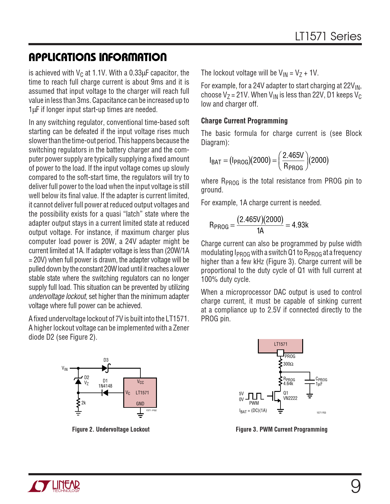 LT1571 Series UUWUAPPLICATIO S I FOR ATIO is achieved with VC at 1.1V. With a 0.33µF capacitor, the The lockout voltage will be VIN = VZ + 1V. time to reach full charge current is about 9ms and it is For example, for a 24V adapter to start charging at 22V assumed that input voltage to the charger will reach full IN, choose V value in less than 3ms. Capacitance can be increased up to Z = 21V. When VIN is less than 22V, D1 keeps VC low and charger off. 1µF if longer input start-up times are needed. In any switching regulator, conventional time-based soft Charge Current Programming starting can be defeated if the input voltage rises much The basic formula for charge current is (see Block slower than the time-out period. This happens because the Diagram): switching regulators in the battery charger and the com- 2. V 465 puter power supply are typically supplying a fixed amount I = I( )( ) BAT PROG 2000 = 2000 of power to the load. If the input voltage comes up slowly RPROG ( ) compared to the soft-start time, the regulators will try to where R deliver full power to the load when the input voltage is still PROG is the total resistance from PROG pin to ground. well below its final value. If the adapter is current limited, it cannot deliver full power at reduced output voltages and For example, 1A charge current is needed. the possibility exists for a quasi “latch” state where the (2. V 465 )( ) 2000 adapter output stays in a current limited state at reduced R = 4.9 k PROG = 3 output voltage. For instance, if maximum charger plus A 1 computer load power is 20W, a 24V adapter might be Charge current can also be programmed by pulse width current limited at 1A. If adapter voltage is less than (20W/1A modulating IPROG with a switch Q1 to RPROG at a frequency = 20V) when full power is drawn, the adapter voltage will be higher than a few kHz (Figure 3). Charge current will be pulled down by the constant 20W load until it reaches a lower proportional to the duty cycle of Q1 with full current at stable state where the switching regulators can no longer 100% duty cycle. supply full load. This situation can be prevented by utilizing When a microprocessor DAC output is used to control undervoltage lockout, set higher than the minimum adapter charge current, it must be capable of sinking current voltage where full power can be achieved. at a compliance up to 2.5V if connected directly to the A fixed undervoltage lockout of 7V is built into the LT1571. PROG pin. A higher lockout voltage can be implemented with a Zener diode D2 (see Figure 2). LT1571 PROG D3 300Ω VIN D2 R C D1 V PROG PROG V CC Z 4.64k 1µF 1N4148 VC LT1571 5V Q1 VN2222 0V 2k GND PWM 1571 F02 IBAT = (DC)(1A) 1571 F03 Figure 2. Undervoltage LockoutFigure 3. PWM Current Programming 9