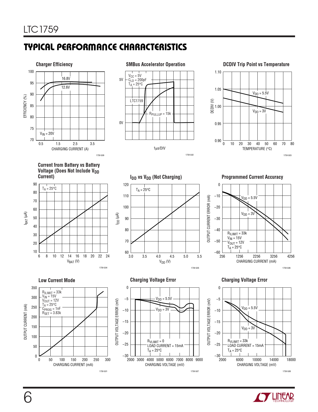100 1.10 VCC = 5V 16.8V 5V CLD = 200pF 95 TA = 25°C 12.6V 1.05 V 90 DD = 5.5V LTC1759 85 1.00 V R DCDIV (V) DD = 3V PULLUP = 15k EFFICIENCY (%) 80 0V 0.95 75 VIN = 20V 70 0.90 0.5 1.5 2.5 3.5 0 10 20 30 40 50 60 70 80 CHARGING CURRENT (A) 1µs/DIV TEMPERATURE (°C) 1759 G02 1759 G09 1759 G03