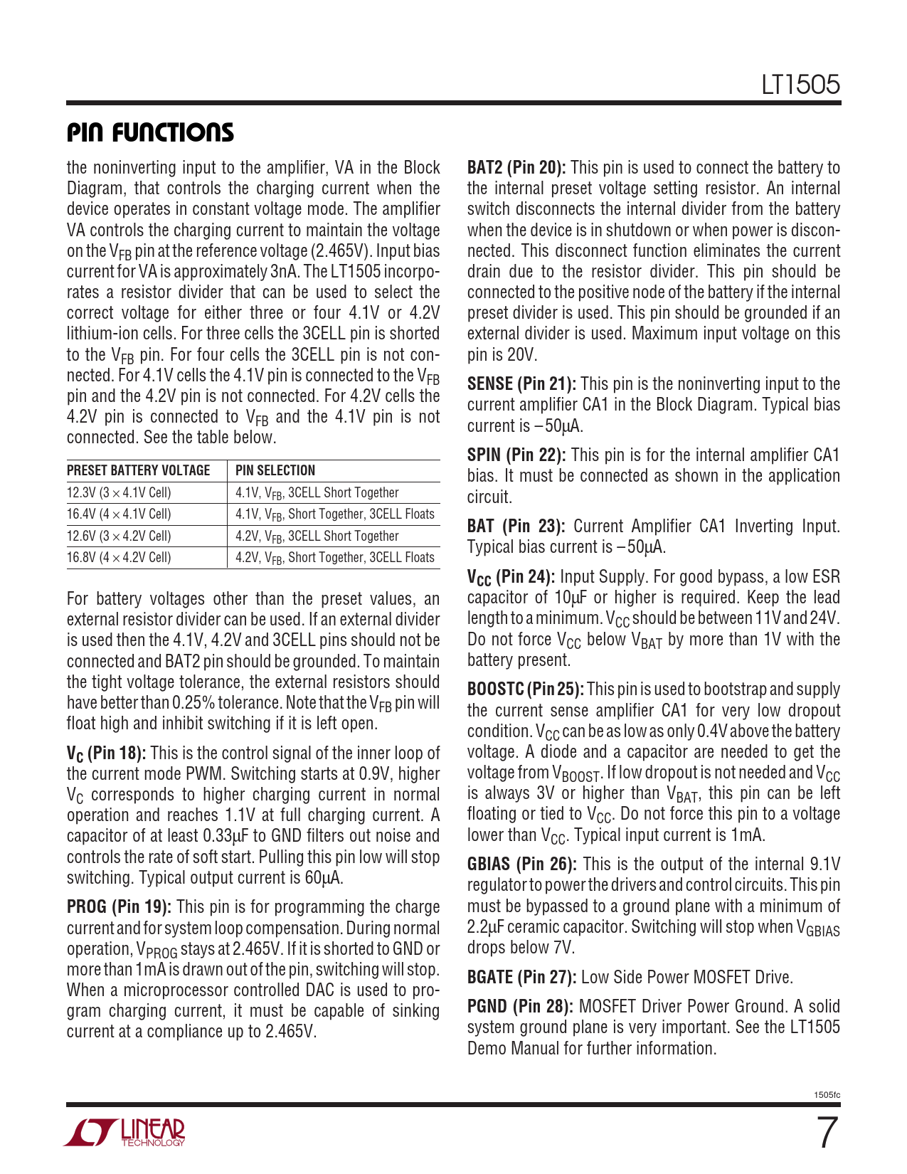 PIN FUNCTIONS. BAT2 (Pin 20):. SENSE (Pin 21):. SPIN (Pin 22):. PRESET BATTERY VOLTAGE. PIN SELECTION. BAT (Pin 23):. VCC (Pin 24):