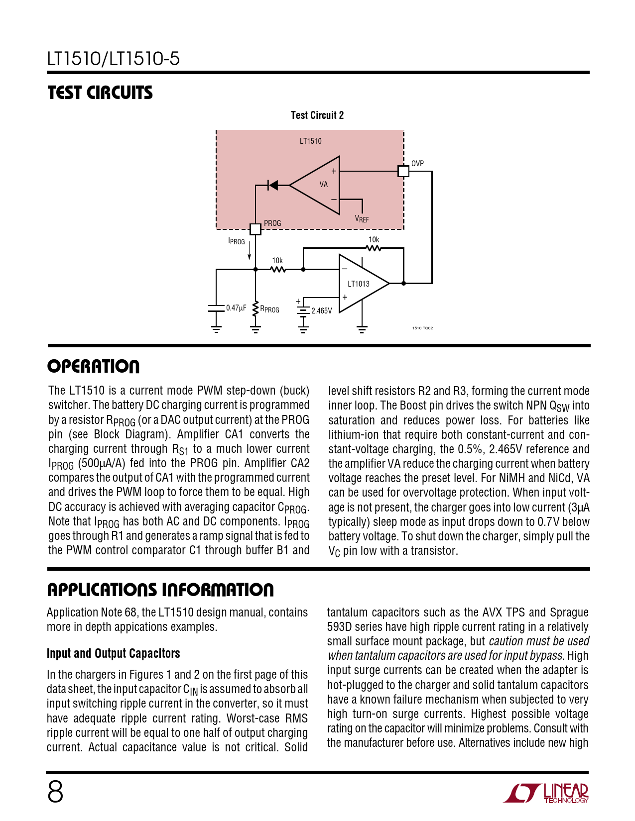 LT1510/LT1510-5 TEST CIRCUITSTest Circuit 2 LT1510 OVP + VA – VREF PROG I 10k PROG 10k – LT1013 + + 0.47µF RPROG 2.465V 1510 TC02 UOPERATIO The LT1510 is a current mode PWM step-down (buck) level shift resistors R2 and R3, forming the current mode switcher. The battery DC charging current is programmed inner loop. The Boost pin drives the switch NPN QSW into by a resistor RPROG (or a DAC output current) at the PROG saturation and reduces power loss. For batteries like pin (see Block Diagram). Amplifier CA1 converts the lithium-ion that require both constant-current and con- charging current through RS1 to a much lower current stant-voltage charging, the 0.5%, 2.465V reference and IPROG (500µA/A) fed into the PROG pin. Amplifier CA2 the amplifier VA reduce the charging current when battery compares the output of CA1 with the programmed current voltage reaches the preset level. For NiMH and NiCd, VA and drives the PWM loop to force them to be equal. High can be used for overvoltage protection. When input volt- DC accuracy is achieved with averaging capacitor CPROG. age is not present, the charger goes into low current (3µA Note that IPROG has both AC and DC components. IPROG typically) sleep mode as input drops down to 0.7V below goes through R1 and generates a ramp signal that is fed to battery voltage. To shut down the charger, simply pull the the PWM control comparator C1 through buffer B1 and VC pin low with a transistor. UUWUAPPLICATIONS INFORMATION Application Note 68, the LT1510 design manual, contains tantalum capacitors such as the AVX TPS and Sprague more in depth appications examples. 593D series have high ripple current rating in a relatively small surface mount package, but caution must be used Input and Output Capacitors when tantalum capacitors are used for input bypass. High In the chargers in Figures 1 and 2 on the first page of this input surge currents can be created when the adapter is data sheet, the input capacitor C hot-plugged to the charger and solid tantalum capacitors IN is assumed to absorb all input switching ripple current in the converter, so it must have a known failure mechanism when subjected to very have adequate ripple current rating. Worst-case RMS high turn-on surge currents. Highest possible voltage ripple current will be equal to one half of output charging rating on the capacitor will minimize problems. Consult with current. Actual capacitance value is not critical. Solid the manufacturer before use. Alternatives include new high 8