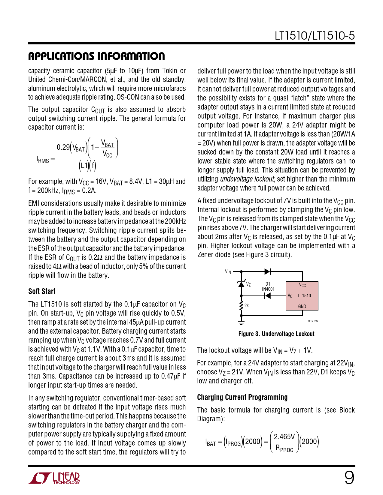 capacity ceramic capacitor (5µF to 10µF) from Tokin or deliver full power to the load when the input voltage is still United Chemi-Con/MARCON, et al., and the old standby, well below its final value. If the adapter is current limited, aluminum electrolytic, which will require more microfarads it cannot deliver full power at reduced output voltages and to achieve adequate ripple rating. OS-CON can also be used. the possibility exists for a quasi “latch” state where the The output capacitor C adapter output stays in a current limited state at reduced OUT is also assumed to absorb output switching current ripple. The general formula for output voltage. For instance, if maximum charger plus capacitor current is: computer load power is 20W, a 24V adapter might be current limited at 1A. If adapter voltage is less than (20W/1A  V  = 20V) when full power is drawn, the adapter voltage will be 0 2 . 9 V BAT ( ) 1− BAT  V  sucked down by the constant 20W load until it reaches a I CC = RMS lower stable state where the switching regulators can no L1 f ( )( ) longer supply full load. This situation can be prevented by For example, with V utilizing undevoltage lockout, set higher than the minimum CC = 16V, VBAT = 8.4V, L1 = 30µH and f = 200kHz, I adapter voltage where full power can be achieved. RMS = 0.2A. EMI considerations usually make it desirable to minimize A fixed undervoltage lockout of 7V is built into the VCC pin. ripple current in the battery leads, and beads or inductors Internal lockout is performed by clamping the VC pin low. may be added to increase battery impedance at the 200kHz The VC pin is released from its clamped state when the VCC switching frequency. Switching ripple current splits be- pin rises above 7V. The charger will start delivering current tween the battery and the output capacitor depending on about 2ms after VC is released, as set by the 0.1µF at VC the ESR of the output capacitor and the battery impedance. pin. Higher lockout voltage can be implemented with a If the ESR of C Zener diode (see Figure 3 circuit). OUT is 0.2Ω and the battery impedance is raised to 4Ω with a bead of inductor, only 5% of the current V ripple will flow in the battery. IN V D1 Z VCC