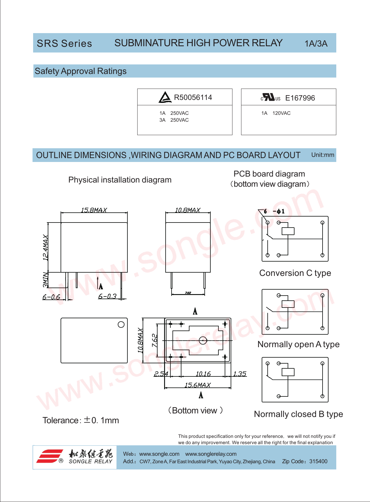 SRS Series SUBMINATURE HIGH POWER RELAY 1A/3A Safety Approval Ratings R50056114 C US E167996 1A 250VAC 1A 120VAC 3A 250VAC OUTLINE DIMENSIONS ,WIRING DIAGRAM AND PC BOARD LAYOUT Unit:mm PCB board diagram Physical installation diagram (bottom view diagram) Conversion C type Normally open A type (Bottom view ) Normally closed B type Tolerance:±0.1mm This product specification only for your reference, we will not notify you if we do any improvement.We reserve all the right for the final explanation Web:www.songle.com www.songlerelay.com Email:sale@songle.com Web:www.songle.com www.songlerelay.com Add.:CW7, Zone A, Far East Industrial Park, Yuyao City, Zhejiang, China i Z p Code:315400 Add.:CW7, Zone A, Far East Industrial Park, Yuyao City, Zhejiang, China Zip Code:315400 Tel.: +86 574 62717777 62762658 62721968 a F x:+86 574 62721978 Document Outline 页 1 页 2