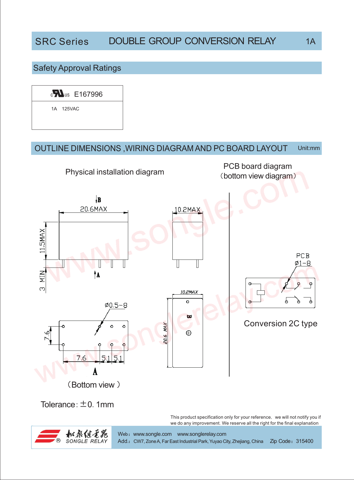SRC Series DOUBLE GROUP CONVERSION RELAY 1A Safety Approval Ratings C US E167996 1A 125VAC OUTLINE DIMENSIONS ,WIRING DIAGRAM AND PC BOARD LAYOUT Unit:mm PCB board diagram Physical installation diagram (bottom view diagram) Conversion 2C type (Bottom view ) Tolerance:±0.1mm This product specification only for your reference, we will not notify you if we do any improvement.We reserve all the right for the final explanation Web:www.songle.com www.songlerelay.com Email:sale@songle.com Web:www.songle.com www.songlerelay.com Add.:CW7, Zone A, Far East Industrial Park, Yuyao City, Zhejiang, China i Z p Code:315400 Add.:CW7, Zone A, Far East Industrial Park, Yuyao City, Zhejiang, China Zip Code:315400 Tel.: +86 574 62717777 62762658 62721968 a F x:+86 574 62721978 Document Outline 页 1 页 2