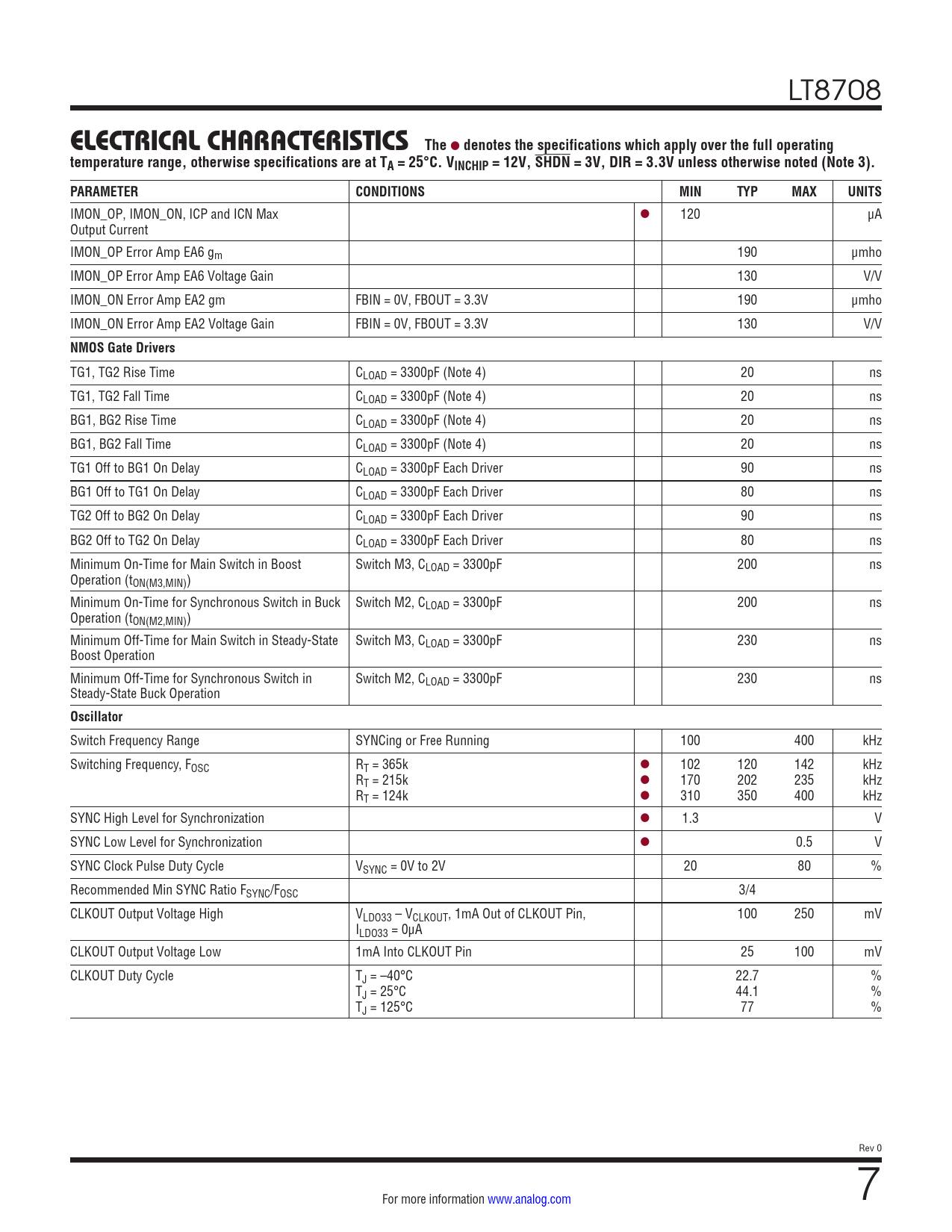 LT8708 ELECTRICAL CHARACTERISTICSThe l denotes the specifications which apply over the full operatingtemperature range, otherwise specifications are at TA = 25°C. VINCHIP = 12V, SHDN = 3V, DIR = 3.3V unless otherwise noted (Note 3). PARAMETERCONDITIONSMINTYPMAXUNITS IMON_OP, IMON_ON, ICP and ICN Max l 120 μA Output Current IMON_OP Error Amp EA6 gm 190 μmho IMON_OP Error Amp EA6 Voltage Gain 130 V/V IMON_ON Error Amp EA2 gm FBIN = 0V, FBOUT = 3.3V 190 μmho IMON_ON Error Amp EA2 Voltage Gain FBIN = 0V, FBOUT = 3.3V 130 V/V NMOS Gate Drivers TG1, TG2 Rise Time CLOAD = 3300pF (Note 4) 20 ns TG1, TG2 Fall Time CLOAD = 3300pF (Note 4) 20 ns BG1, BG2 Rise Time CLOAD = 3300pF (Note 4) 20 ns BG1, BG2 Fall Time CLOAD = 3300pF (Note 4) 20 ns TG1 Off to BG1 On Delay CLOAD = 3300pF Each Driver 90 ns BG1 Off to TG1 On Delay CLOAD = 3300pF Each Driver 80 ns TG2 Off to BG2 On Delay CLOAD = 3300pF Each Driver 90 ns BG2 Off to TG2 On Delay CLOAD = 3300pF Each Driver 80 ns Minimum On-Time for Main Switch in Boost Switch M3, CLOAD = 3300pF 200 ns Operation (tON(M3,MIN)) Minimum On-Time for Synchronous Switch in Buck Switch M2, CLOAD = 3300pF 200 ns Operation (tON(M2,MIN)) Minimum Off-Time for Main Switch in Steady-State Switch M3, CLOAD = 3300pF 230 ns Boost Operation Minimum Off-Time for Synchronous Switch in Switch M2, CLOAD = 3300pF 230 ns Steady-State Buck Operation Oscillator Switch Frequency Range SYNCing or Free Running 100 400 kHz Switching Frequency, FOSC RT = 365k l 102 120 142 kHz RT = 215k l 170 202 235 kHz RT = 124k l 310 350 400 kHz SYNC High Level for Synchronization l 1.3 V SYNC Low Level for Synchronization l 0.5 V SYNC Clock Pulse Duty Cycle VSYNC = 0V to 2V 20 80 % Recommended Min SYNC Ratio FSYNC/FOSC 3/4 CLKOUT Output Voltage High VLDO33 – VCLKOUT, 1mA Out of CLKOUT Pin, 100 250 mV ILDO33 = 0μA CLKOUT Output Voltage Low 1mA Into CLKOUT Pin 25 100 mV CLKOUT Duty Cycle TJ = –40°C 22.7 % TJ = 25°C 44.1 % TJ = 125°C 77 % Rev 0 For more information www.analog.com 7 Document Outline Features Applications Typical Application Description Absolute Maximum Ratings Order Information Pin Configuration Electrical Characteristics Typical Performance Characteristics Typical Performance Characteristics Pin Functions Block Diagram Operation Typographical Conventions Start-Up Start-Up: SHDN Pin Start-Up: SWEN Pin Start-Up: Soft-Start of Switching Regulator Control Overview Power Switch Control Switch Control: Buck Region (VIN >> VOUT) Switch Control: Buck-Boost (VIN ≅ VOUT) Switch Control: Boost Region (VIN << VOUT) Switch Control: Soft-Start Uni and Bidirectional Conduction Bidirectional Conduction: CCM Unidirectional Conduction: DCM Unidirectional Conduction: HCM Unidirectional Conduction: Burst Mode Error Amplifiers VOUT Regulation and Sensing VOUT: Regulation VOUT: Above Regulation VOUT: Below Regulation and Undervoltage VIN Regulation and Sensing VIN: Regulation VIN: Above Regulation and Overvoltage VIN: Below Regulation Current Monitoring and Limiting Monitoring and Limiting: IMON Pins Monitoring: ICP and ICN Pins INTVCC/EXTVCC/GATEVCC/LDO33 Power CLKOUT and Temperature Sensing Applications Information Verify the Power Flow Conditions Operating Frequency Selection Internal Oscillator SYNC Pin and Clock Synchronization CLKOUT Pin and Clock Synchronization Inductor Current Sensing and Slope Compensation RSENSE Selection and Maximum Current RSENSE Selection: Max RSENSE in the Boost Region RSENSE Selection: Max RSENSE in the Buck Region RSENSE Selection: Final RSENSE Value RSENSE Filtering Inductor (L) Selection L Selection: Load Current in Buck and Boost Regions L Selection: Subharmonic Oscillations L Selection: Maximum Current Rating Power MOSFET Selection CIN and COUT Selection Schottky Diode (D1, D2, D3, D4) Selection Topside MOSFET Driver Supply (CB1, DB1, CB2, DB2) Top Driver: Boost Cap Charge Control Block Top Driver: Boost Diodes DB1 and DB2 VINHIMON, VOUTLOMON and RVSOFF IIN and IOUT Current Monitoring and Limiting Loop Compensation INTVCC Regulators and EXTVCC Connection LDO33 Regulator Voltage Lockouts Junction Temperature Measurement Thermal Shutdown Efficiency Considerations Circuit Board Layout Checklist Hot Plugging Considerations Design Example Typical Applications Package Description Typical Application Related Parts