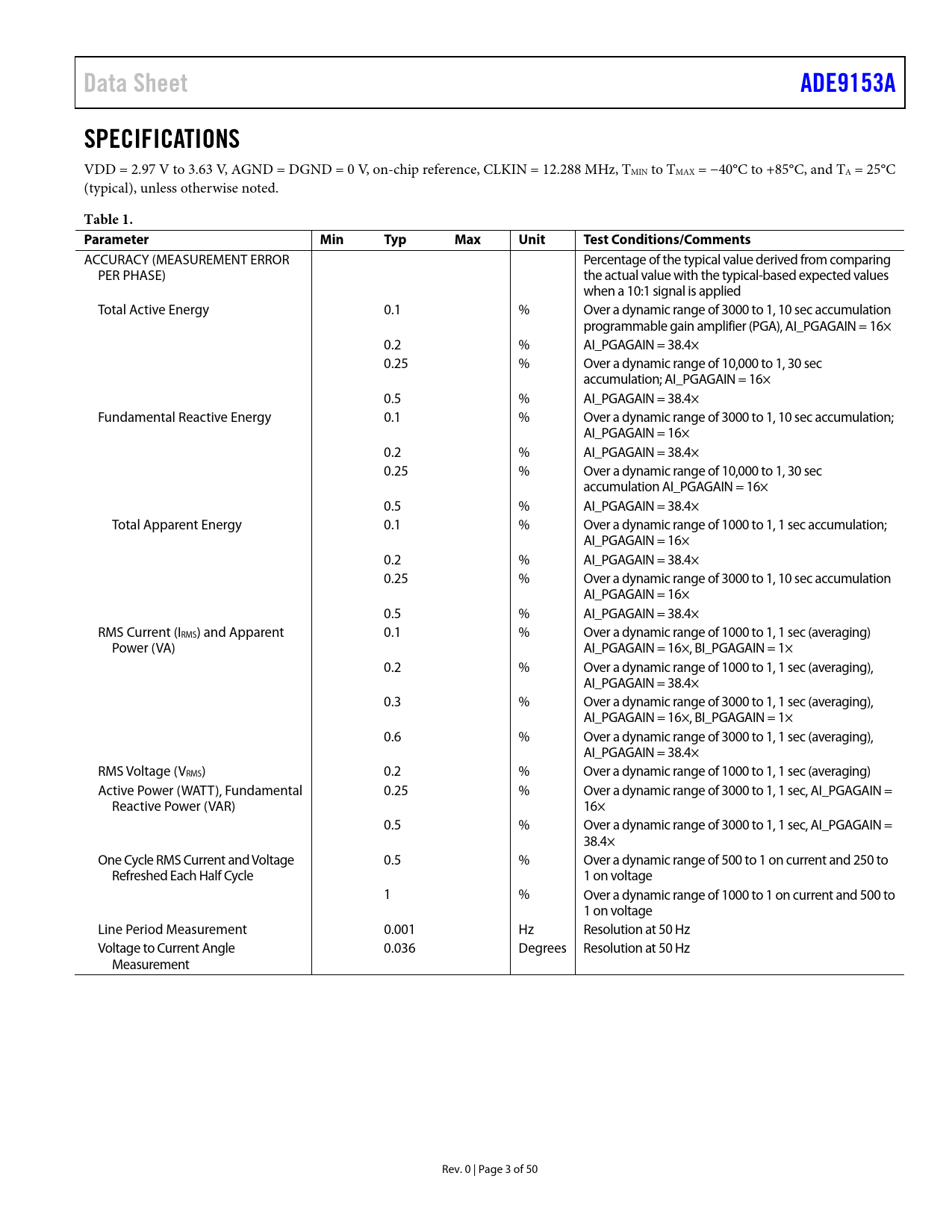 Data SheetADE9153ASPECIFICATIONS VDD = 2.97 V to 3.63 V, AGND = DGND = 0 V, on-chip reference, CLKIN = 12.288 MHz, TMIN to TMAX = −40°C to +85°C, and TA = 25°C (typical), unless otherwise noted. Table 1. ParameterMinTypMaxUnitTest Conditions/Comments ACCURACY (MEASUREMENT ERROR Percentage of the typical value derived from comparing PER PHASE) the actual value with the typical-based expected values when a 10:1 signal is applied Total Active Energy 0.1 % Over a dynamic range of 3000 to 1, 10 sec accumulation programmable gain amplifier (PGA), AI_PGAGAIN = 16× 0.2 % AI_PGAGAIN = 38.4× 0.25 % Over a dynamic range of 10,000 to 1, 30 sec accumulation; AI_PGAGAIN = 16× 0.5 % AI_PGAGAIN = 38.4× Fundamental Reactive Energy 0.1 % Over a dynamic range of 3000 to 1, 10 sec accumulation; AI_PGAGAIN = 16× 0.2 % AI_PGAGAIN = 38.4× 0.25 % Over a dynamic range of 10,000 to 1, 30 sec accumulation AI_PGAGAIN = 16× 0.5 % AI_PGAGAIN = 38.4× Total Apparent Energy 0.1 % Over a dynamic range of 1000 to 1, 1 sec accumulation; AI_PGAGAIN = 16× 0.2 % AI_PGAGAIN = 38.4× 0.25 % Over a dynamic range of 3000 to 1, 10 sec accumulation AI_PGAGAIN = 16× 0.5 % AI_PGAGAIN = 38.4× RMS Current (IRMS) and Apparent 0.1 % Over a dynamic range of 1000 to 1, 1 sec (averaging) Power (VA) AI_PGAGAIN = 16×, BI_PGAGAIN = 1× 0.2 % Over a dynamic range of 1000 to 1, 1 sec (averaging), AI_PGAGAIN = 38.4× 0.3 % Over a dynamic range of 3000 to 1, 1 sec (averaging), AI_PGAGAIN = 16×, BI_PGAGAIN = 1× 0.6 % Over a dynamic range of 3000 to 1, 1 sec (averaging), AI_PGAGAIN = 38.4× RMS Voltage (VRMS) 0.2 % Over a dynamic range of 1000 to 1, 1 sec (averaging) Active Power (WATT), Fundamental 0.25 % Over a dynamic range of 3000 to 1, 1 sec, AI_PGAGAIN = Reactive Power (VAR) 16× 0.5 % Over a dynamic range of 3000 to 1, 1 sec, AI_PGAGAIN = 38.4× One Cycle RMS Current and Voltage 0.5 % Over a dynamic range of 500 to 1 on current and 250 to Refreshed Each Half Cycle 1 on voltage 1 % Over a dynamic range of 1000 to 1 on current and 500 to 1 on voltage Line Period Measurement 0.001 Hz Resolution at 50 Hz Voltage to Current Angle 0.036 Degrees Resolution at 50 Hz Measurement Rev. 0 | Page 3 of 50 Document Outline FEATURES APPLICATIONS GENERAL DESCRIPTION TYPICAL APPLICATIONS CIRCUIT TABLE OF CONTENTS REVISION HISTORY SPECIFICATIONS AUTOCALIBRATION SPI TIMING CHARACTERISTICS ABSOLUTE MAXIMUM RATINGS THERMAL RESISTANCE ESD CAUTION PIN CONFIGURATION AND FUNCTION DESCRIPTIONS TYPICAL PERFORMANCE CHARACTERISTICS ENERGY LINEARITY OVER SUPPLY AND TEMPERATURE ENERGY ERROR OVER FREQUENCY AND POWER FACTOR RMS LINEARITY OVER TEMPERATURE AND RMS ERROR OVER FREQUENCY SIGNAL-TO-NOISE RATIO (SNR) PERFORMANCE OVER DYNAMIC RANGE TEST CIRCUIT TERMINOLOGY THEORY OF OPERATION mSURE AUTOCALIBRATION FEATURE mSure System Warning Interrupts MEASUREMENTS Current Channel Current Channel Gain, xIGAIN High-Pass Filter Digital Integrator Phase Compensation Voltage Channel RMS and Power Measurements Total RMS Total Active Power Fundamental Reactive Power Total Apparent Power Energy Accumulation, Power Accumulation, and No Load Detection Features Energy Accumulation Energy Accumulation Modes Reset Energy Register on Read Power Accumulation No Load Detection Feature Digital to Frequency Conversion—CFx Output Calibration Frequency (CF) Energy Selection Configuring the CFx Pulse Width CFx Pulse Sign Clearing the CFx Accumulator POWER QUALITY MEASUREMENTS Zero-Crossing Detection CF1/ZX/DREADY Zero-Crossing Timeout Line Period Calculation Angle Measurement One Cycle RMS Measurement Dip and Swell Indication Overcurrent Indication Peak Detection Power Factor Temperature APPLICATIONS INFORMATION INTERRUPTS/EVENTS PIN INTERRUPTS SERVICING INTERRUPTS CF2/ZX/DREADY EVENT PIN ACCESSING ON-CHIP DATA SPI PROTOCOL OVERVIEW UART INTERFACE COMMUNICATION VERIFICATION REGISTERS CRC OF CONFIGURATION REGISTERS CONFIGURATION LOCK REGISTER INFORMATION REGISTER SUMMARY REGISTER DETAILS OUTLINE DIMENSIONS ORDERING GUIDE