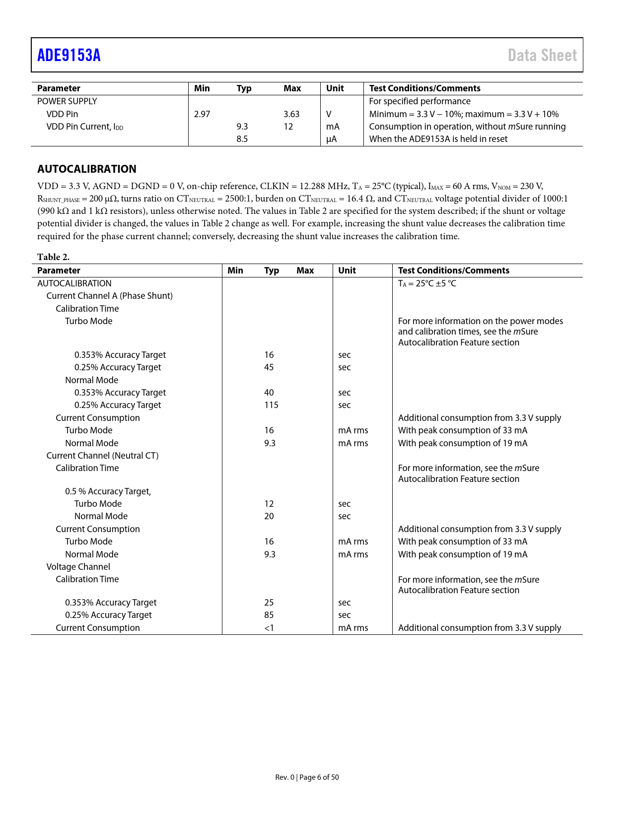 ADE9153A. Data Sheet. Parameter. Min. Typ. Max. Unit. Test Conditions/Comments. AUTOCALIBRATION. Table 2. Parameter