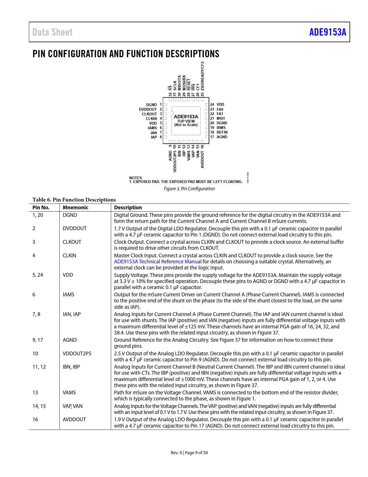Pages / Page50 / 9 — Data Sheet. ADE9153A. PIN CONFIGURATION AND FUNCTION DESCRIPTIONS. 2 /CF. …