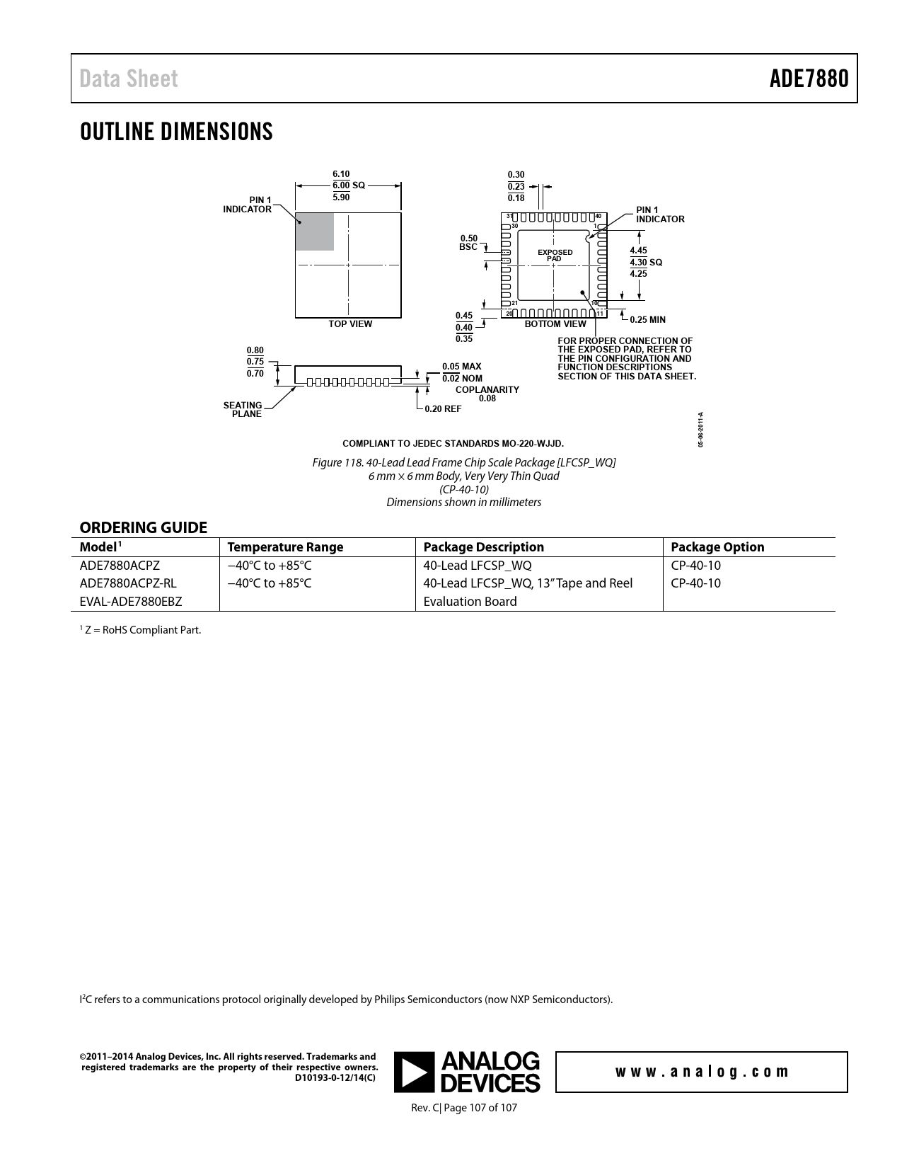 ADE7880ACPZ −40°C to +85°C 40-Lead LFCSP_WQ CP-40-10 ADE7880ACPZ-RL −40°C to +85°C 40-Lead LFCSP_WQ, 13” Tape and Reel CP-40-10 EVAL-ADE7880EBZ Evaluation Board 1 Z = RoHS Compliant Part. I2C refers to a communications protocol original y developed by Philips Semiconductors (now NXP Semiconductors).