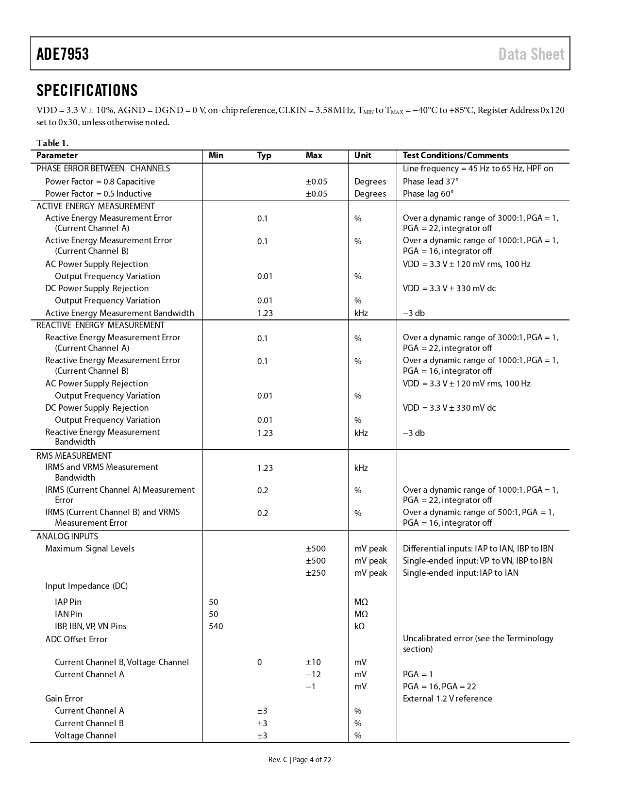 Pages / Page72 / 4 — ADE7953. Data Sheet. SPECIFICATIONS. Table 1. Parameter. Min. Typ. Max. …