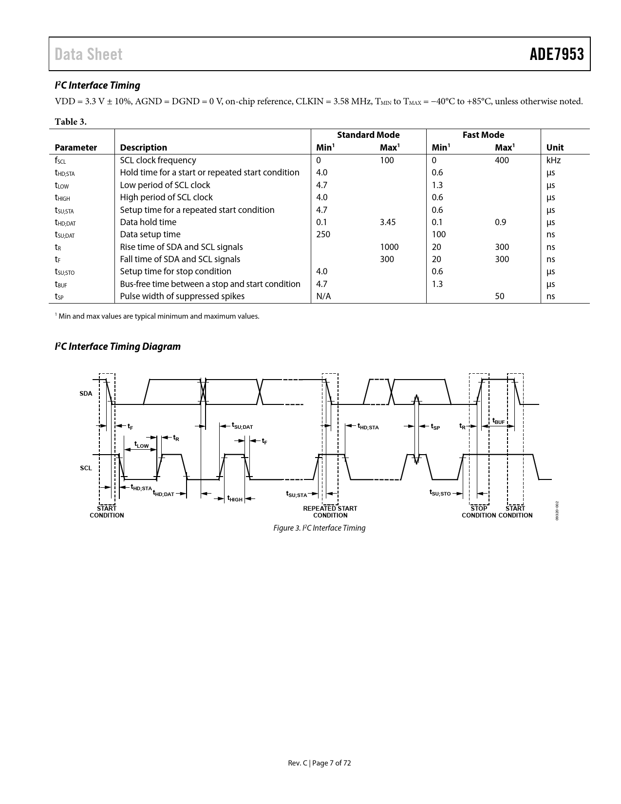 Data Sheet. ADE7953. I2C Interface Timing. Table 3. Standard Mode. Fast Mode. Parameter Description. Min1 Max1 Min1 Max1 Unit