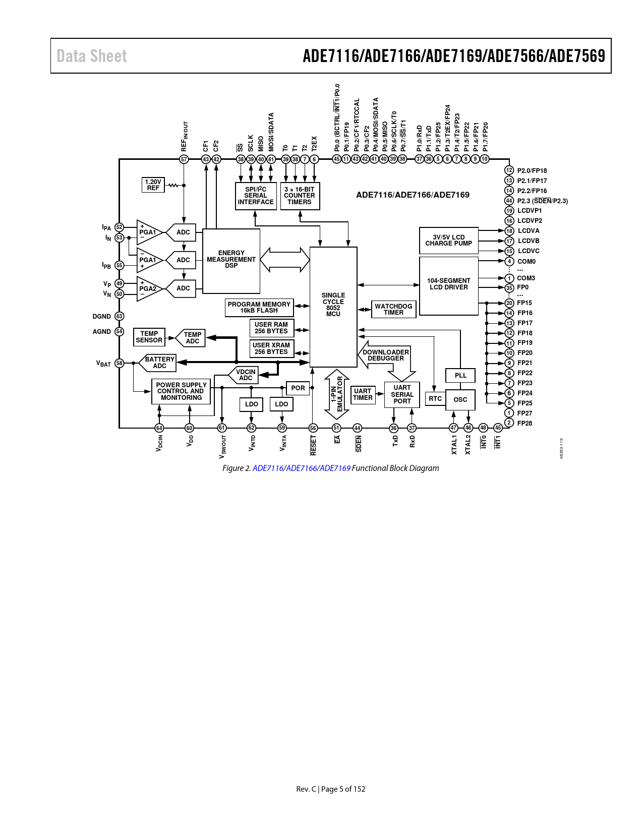 Data Sheet ADE7116/ADE7166/ADE7169/ADE7566/ADE7569 0) 0. P 1/ TA A 4 /INT 2 CCAL D 3 TA /T0 RL /FP 2 T A RT I/S X D 19 1/ 2 LK /T1 SO 25 E /FP 22 21 20 /OU OS P C S BCT xD P P P P IN K I/S F CF CF /M /MI /S /S RxD T F /T2 F F F /T2 F X 1 2 0 ( 1/ 2/ 3/ .4 .5 .6 .7 0/ 1/ 2/ .3 5/ 6/ 7/ .4 CL SO OS 2E 0. 0. 0. 0. 0 0 0 1. 1. 1. 1 1 1. 1. 1. RE CF CF SS S MI M T0 T1 T2 T P P P P P P0 P P P P P P P P P P 57 43 42 38 39 40 41 39 38 7 6 45 11 43 42 41 40 39 38 37 36 5 6 7 8 9 10 12 P2.0/FP18 1.20V 13 P2.1/FP17 REF SPI/I2C 3 × 16-BIT 14 P2.2/FP16 SERIAL COUNTER ADE7116/ADE7166/ADE7169 INTERFACE TIMERS 44 P2.3 (SDEN/P2.3) 19 LCDVP1 16 LCDVP2 I + PA 52 18 LCDVA PGA1 ADC IN 53 3V/5V LCD CHARGE PUMP 17 LCDVB ENERGY 15 LCDVC PGA1 ADC MEASUREMENT 4 COM0 IPB 55 + DSP ... ... 1 COM3 V + 104-SEGMENT P 49 PGA2 ADC LCD DRIVER 35 FP0 VN 50 SINGLE ... ... CYCLE 20 FP15 PROGRAM MEMORY 8052 WATCHDOG 16kB FLASH MCU TIMER 14 FP16 DGND 63 13 FP17 USER RAM AGND 54 256 BYTES 12 TEMP FP18 TEMP SENSOR ADC 11 FP19 USER XRAM 256 BYTES DOWNLOADER 10 FP20 BATTERY DEBUGGER VBAT 58 9 FP21 ADC VDCIN 8 FP22 ADC PLL 7 FP23 POWER SUPPLY POR N TOR UART CONTROL AND UART SERIAL 6 FP24 MONITORING -PI LA TIMER RTC 1 U OSC PORT LDO 5 FP25 LDO M E 1 FP27 2 FP28 64 60 61 62 59 56 51 44 36 37 47 46 48 45 N D A DD UT EA EN xD L1 L2 T0 T1 DCI V O INT INT T RxD IN IN