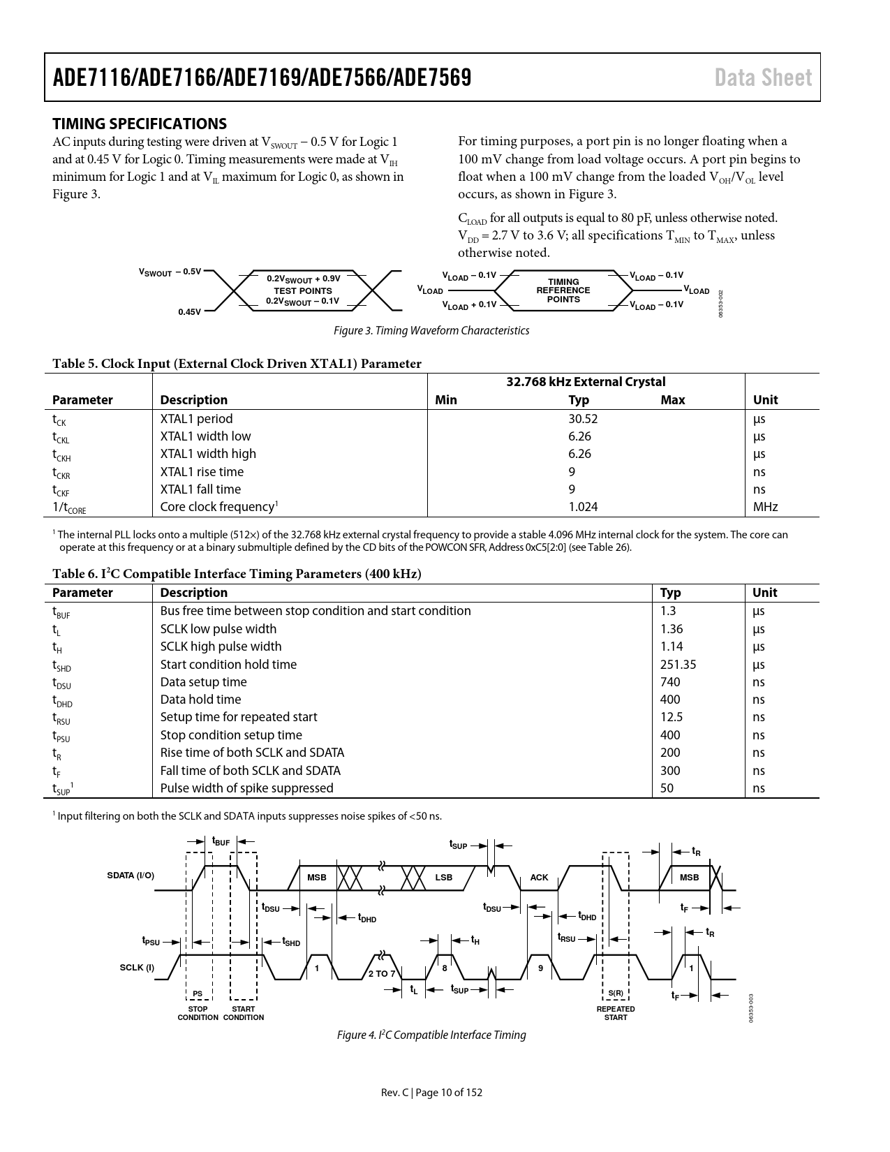link to page 10 link to page 10 link to page 32 ADE7116/ADE7166/ADE7169/ADE7566/ADE7569Data SheetTIMING SPECIFICATIONS AC inputs during testing were driven at VSWOUT − 0.5 V for Logic 1 For timing purposes, a port pin is no longer floating when a and at 0.45 V for Logic 0. Timing measurements were made at VIH 100 mV change from load voltage occurs. A port pin begins to minimum for Logic 1 and at VIL maximum for Logic 0, as shown in float when a 100 mV change from the loaded VOH/VOL level Figure 3. occurs, as shown in Figure 3. CLOAD for all outputs is equal to 80 pF, unless otherwise noted. VDD = 2.7 V to 3.6 V; all specifications TMIN to TMAX, unless otherwise noted. VSWOUT – 0.5V0.2VVVSWOUT + 0.9VLOAD – 0.1VTIMINGLOAD – 0.1VTEST POINTSVLOADREFERENCEVLOAD0.2VPOINTS 002 SWOUT – 0.1VVLOAD + 0.1VVLOAD – 0.1V0.45V 06353- Figure 3. Timing Waveform Characteristics Table 5. Clock Input (External Clock Driven XTAL1) Parameter32.768 kHz External CrystalParameterDescriptionMinTypMaxUnit t XTAL1 period 30.52 µs CK t XTAL1 width low 6.26 µs CKL t XTAL1 width high 6.26 µs CKH t XTAL1 rise time 9 ns CKR t XTAL1 fall time 9 ns CKF 1/t Core clock frequency1 1.024 MHz CORE 1 The internal PLL locks onto a multiple (512×) of the 32.768 kHz external crystal frequency to provide a stable 4.096 MHz internal clock for the system. The core can operate at this frequency or at a binary submultiple defined by the CD bits of the POWCON SFR, Address 0xC5[2:0] (see Table 26). Table 6. I2C Compatible Interface Timing Parameters (400 kHz) ParameterDescriptionTypUnit t Bus free time between stop condition and start condition 1.3 µs BUF t SCLK low pulse width 1.36 µs L t SCLK high pulse width 1.14 µs H t Start condition hold time 251.35 µs SHD t Data setup time 740 ns DSU t Data hold time 400 ns DHD t Setup time for repeated start 12.5 ns RSU t Stop condition setup time 400 ns PSU t Rise time of both SCLK and SDATA 200 ns R t Fall time of both SCLK and SDATA 300 ns F t 1 Pulse width of spike suppressed 50 ns SUP 1 Input filtering on both the SCLK and SDATA inputs suppresses noise spikes of <50 ns. tBUFtSUPtRSDATA (I/O)MSBLSBACKMSBtDSUtDSUtFttDHDDHDtRtttPSUtRSUSHDHSCLK (I)18912 TO 7ttPSLSUPS(R)tF 003 STOPSTARTREPEATEDCONDITION CONDITIONSTART 06353- Figure 4. I2C Compatible Interface Timing Rev. C | Page 10 of 152 Document Outline GENERAL FEATURES ENERGY MEASUREMENT FEATURES MICROPROCESSOR FEATURES REVISION HISTORY GENERAL DESCRIPTION FUNCTIONAL BLOCK DIAGRAMS SPECIFICATIONS ENERGY METERING ANALOG PERIPHERALS DIGITAL INTERFACE TIMING SPECIFICATIONS ABSOLUTE MAXIMUM RATINGS THERMAL RESISTANCE ESD CAUTION PIN CONFIGURATIONS AND FUNCTION DESCRIPTIONS TYPICAL PERFORMANCE CHARACTERISTICS PERFORMANCE CURVES FOR THE ADE7169 AND ADE7569 ONLY TERMINOLOGY SPECIAL FUNCTION REGISTER (SFR) MAPPING POWER MANAGEMENT POWER MANAGEMENT REGISTER DETAILS Writing to the Interrupt Pins Configuration SFR (INTPR, Address 0xFF) Clearing the Scratch Pad Registers (SCRATCH1, Address 0xFB to SCRATCH4, Address 0xFE) Writing to the Power Control SFR (POWCON, Address 0xC5) POWER SUPPLY ARCHITECTURE BATTERY SWITCHOVER VDD to VBAT Switching from VBAT to VDD POWER SUPPLY MANAGEMENT (PSM) INTERRUPT Battery Switchover and Power Supply Restored PSM Interrupt VDCIN ADC PSM Interrupt VBAT Monitor PSM Interrupt VDCIN Monitor PSM Interrupt SAG Monitor PSM Interrupt USING THE POWER SUPPLY FEATURES OPERATING MODES PSM0 (NORMAL MODE) PSM1 (BATTERY MODE) PSM2 (SLEEP MODE) 3.3 V PERIPHERALS AND WAKE-UP EVENTS TRANSITIONING BETWEEN OPERATING MODES Automatic Battery Switchover (PSM0 to PSM1) Entering Sleep Mode (PSM1 to PSM2) Servicing Wake-Up Events (PSM2 to PSM1) Automatic Switch to VDD (PSM2 to PSM0) USING THE POWER MANAGEMENT FEATURES ENERGY MEASUREMENT ACCESS TO ENERGY MEASUREMENT SFRs ACCESS TO INTERNAL ENERGY MEASUREMENT REGISTERS Writing to the Internal Energy Measurement Registers Reading the Internal Energy Measurement Registers ENERGY MEASUREMENT REGISTERS ENERGY MEASUREMENT INTERNAL REGISTER DETAILS INTERRUPT STATUS/ENABLE SFRs ANALOG INPUTS ANALOG-TO-DIGITAL CONVERSION Antialiasing Filter ADC Transfer Function Current Channel ADC Voltage Channel ADC Channel Sampling FAULT DETECTION Channel Selection Indication Fault Indication Fault with Active Input Greater Than Inactive Input Fault with Inactive Input Greater Than Active Input Calibration Concerns di/dt CURRENT SENSOR AND DIGITAL INTEGRATOR FOR THE ADE7169/ADE7569 POWER QUALITY MEASUREMENTS Zero-Crossing Detection Zero-Crossing Timeout Period or Frequency Measurements Line Voltage SAG Detection SAG Level Set Peak Detection Peak Level Set Peak Level Record PHASE COMPENSATION RMS CALCULATION Current Channel RMS Calculation Current Channel RMS Offset Compensation Voltage Channel RMS Calculation Voltage Channel RMS Offset Compensation ACTIVE POWER CALCULATION Active Power Gain Calibration Active Power Offset Calibration Active Power Sign Detection Active Power No Load Detection ACTIVE ENERGY CALCULATION Integration Time Under Steady Load: Active Energy Active Energy Accumulation Modes Watt Signed Accumulation Mode Watt Positive Only Accumulation Mode Watt Absolute Accumulation Mode Active Energy Pulse Output Line Cycle Active Energy Accumulation Mode REACTIVE POWER CALCULATION (ADE7169/ADE7569) Reactive Power Gain Calibration Reactive Power Offset Calibration Sign of Reactive Power Calculation Reactive Power Sign Detection Reactive Power No Load Detection REACTIVE ENERGY CALCULATION (ADE7169/ADE7569) Integration Time Under Steady Load: Reactive Energy Reactive Energy Accumulation Modes Var Signed Accumulation Mode Var Antitamper Accumulation Mode Var Absolute Accumulation Mode Reactive Energy Pulse Output Line Cycle Reactive Energy Accumulation Mode APPARENT POWER CALCULATION Apparent Power Offset Calibration APPARENT ENERGY CALCULATION Integration Time Under Steady Load: Apparent Energy Apparent Energy Pulse Output Line Apparent Energy Accumulation Apparent Power No Load Detection AMPERE
