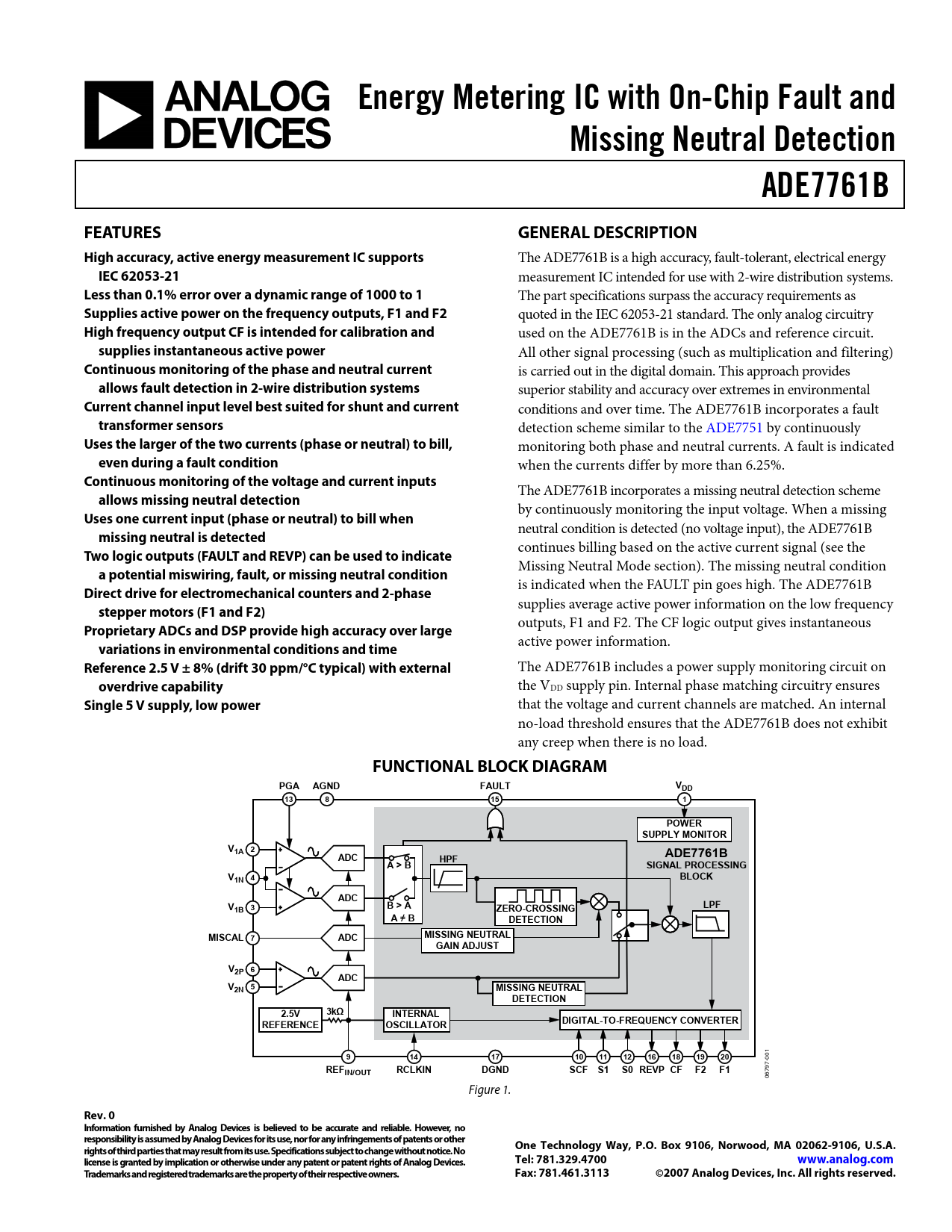 Energy Metering IC with On-Chip Fault and. Missing Neutral Detection. ADE7761B. FEATURES. GENERAL DESCRIPTION