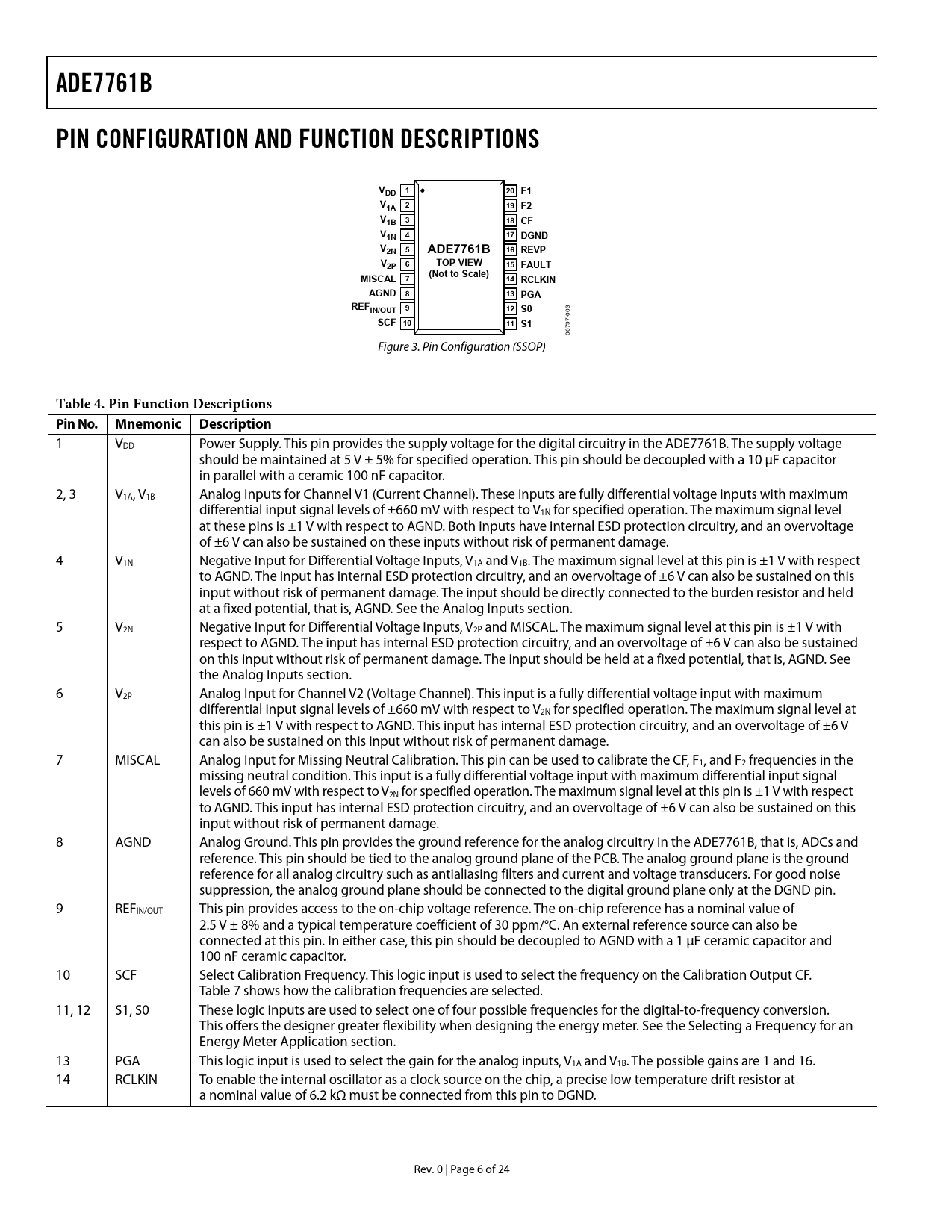 Pages / Page24 / 6 — ADE7761B. PIN CONFIGURATION AND FUNCTION DESCRIPTIONS. VDD 1. 20 F1. V1A …