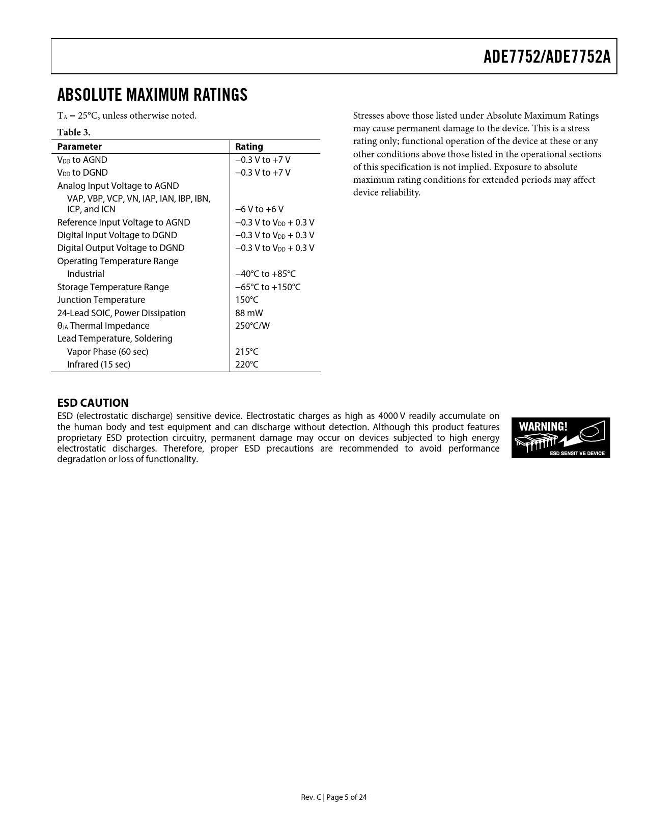 ADE7752/ADE7752A. ABSOLUTE MAXIMUM RATINGS. Table 3. Parameter Rating. ESD CAUTION