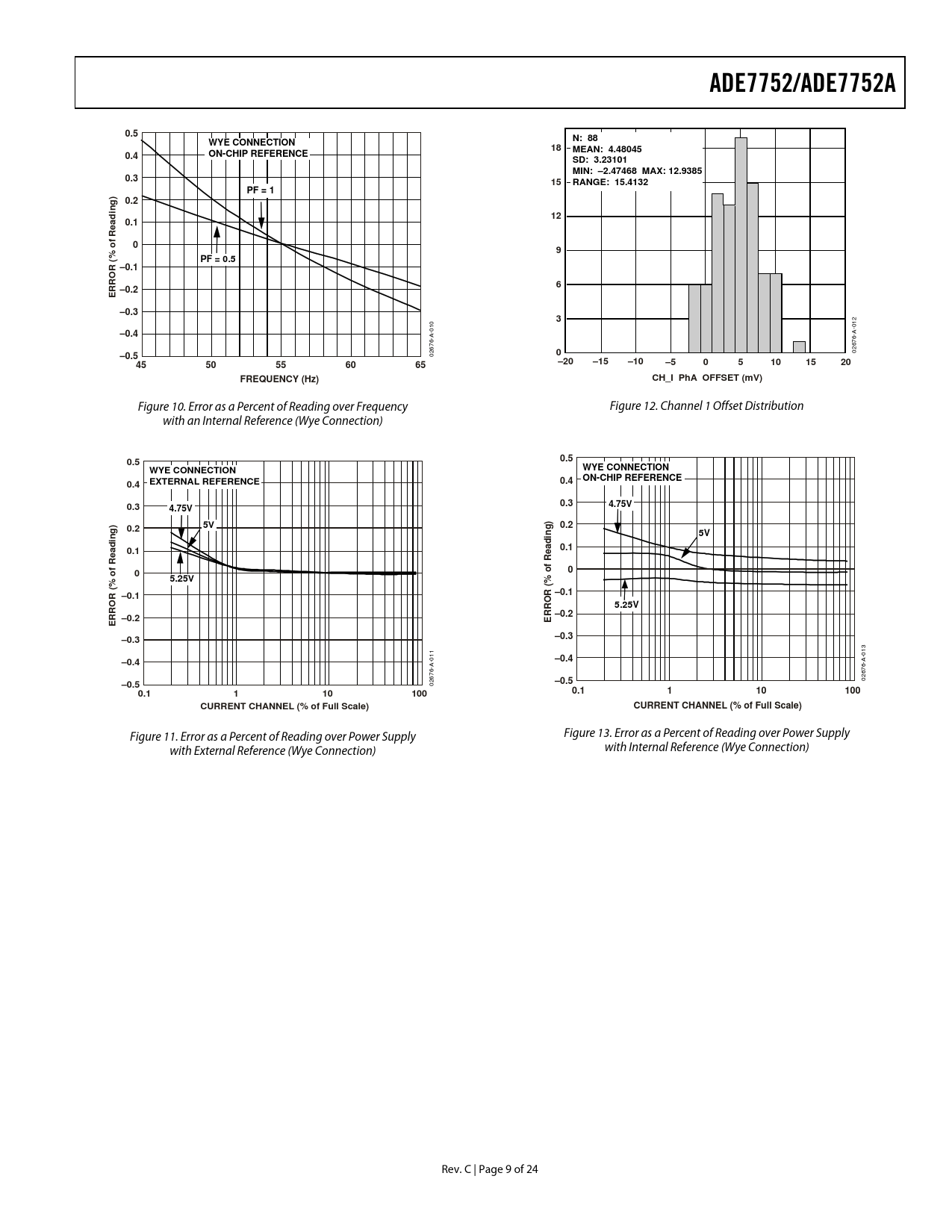 ADE7752/ADE7752A 0.5 N: 88 WYE CONNECTION 18 MEAN: 4.48045 0.4 ON-CHIP REFERENCE SD: 3.23101 MIN: –2.47468 MAX: 12.9385 0.3 15 RANGE: 15.4132 PF = 1 0.2 ding) 12 a 0.1 0 9 PF = 0.5 –0.1 6 RROR (% of Re –0.2 E –0.3 3