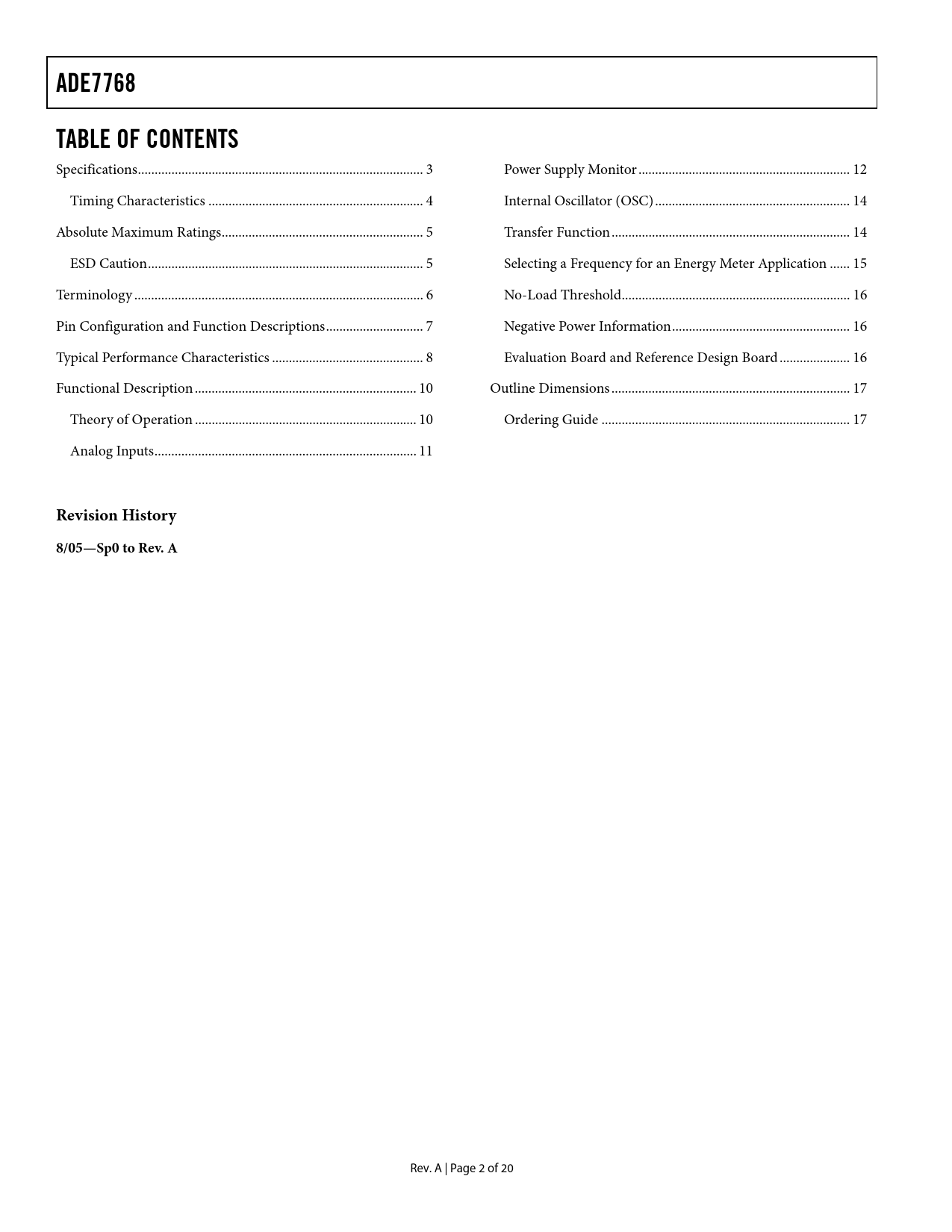 link to page 3 link to page 3 link to page 4 link to page 4 link to page 5 link to page 5 link to page 5 link to page 5 link to page 6 link to page 6 link to page 7 link to page 7 link to page 8 link to page 8 link to page 10 link to page 10 link to page 10 link to page 10 link to page 11 link to page 11 link to page 12 link to page 12 link to page 14 link to page 14 link to page 14 link to page 14 link to page 15 link to page 15 link to page 16 link to page 16 link to page 16 link to page 16 link to page 16 link to page 16 link to page 17 link to page 17 link to page 17 link to page 17 ADE7768TABLE OF CONTENTS Specifications... 3 Power Supply Monitor ... 12 Timing Characteristics .. 4 Internal Oscillator (OSC).. 14 Absolute Maximum Ratings.. 5 Transfer Function... 14 ESD Caution.. 5 Selecting a Frequency for an Energy Meter Application .. 15 Terminology .. 6 No-Load Threshold.. 16 Pin Configuration and Function Descriptions... 7 Negative Power Information... 16 Typical Performance Characteristics ... 8 Evaluation Board and Reference Design Board ... 16 Functional Description .. 10 Outline Dimensions ... 17 Theory of Operation .. 10 Ordering Guide .. 17 Analog Inputs.. 11 Revision History8/05—Sp0 to Rev. A Rev. A | Page 2 of 20 Document Outline FEATURES GENERAL DESCRIPTION FUNCTIONAL BLOCK DIAGRAM SPECIFICATIONS TIMING CHARACTERISTICS ABSOLUTE MAXIMUM RATINGS ESD CAUTION TERMINOLOGY PIN CONFIGURATION AND FUNCTION DESCRIPTIONS TYPICAL PERFORMANCE CHARACTERISTICS FUNCTIONAL DESCRIPTION THEORY OF OPERATION Power Factor Considerations Nonsinusoidal Voltage and Current ANALOG INPUTS Channel V1 (Current Channel) Channel V2 (Voltage Channel) Typical Connection Diagrams POWER SUPPLY MONITOR HPF and Offset Effects Digital-to-Frequency Conversion Connecting to a Microcontroller for Energy Measurement Power Measurement Considerations INTERNAL OSCILLATOR (OSC) TRANSFER FUNCTION Frequency Outputs F1 and F2 Example Frequency Output CF SELECTING A FREQUENCY FOR AN ENERGY METER APPLICATION Frequency Outputs NO-LOAD THRESHOLD NEGATIVE POWER INFORMATION EVALUATION BOARD AND REFERENCE DESIGN BOARD OUTLINE DIMENSIONS ORDERING GUIDE