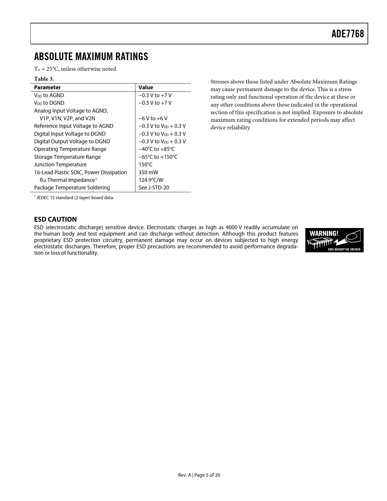 Pages / Page20 / 5 — ADE7768. ABSOLUTE MAXIMUM RATINGS. Table 3. Parameter Value. ESD CAUTION