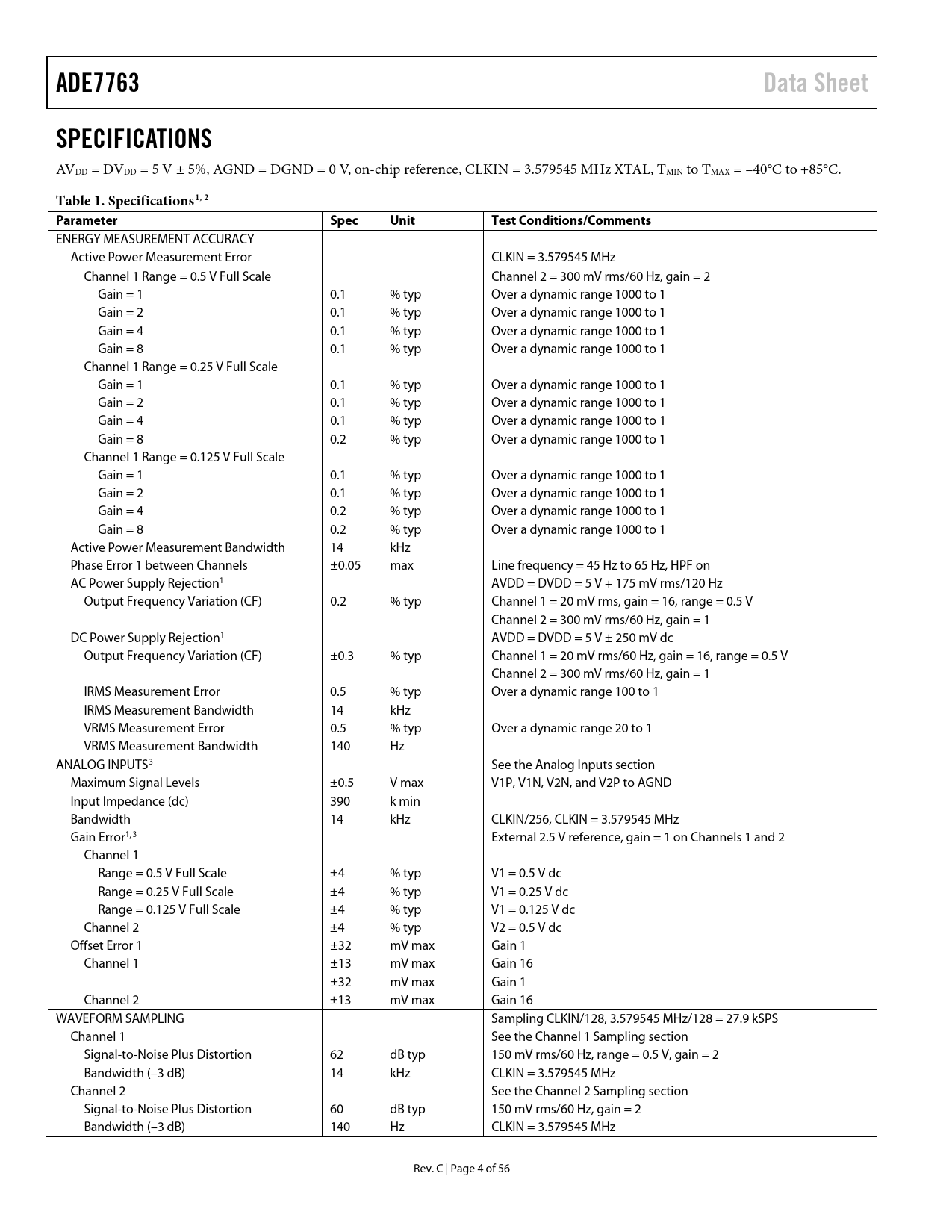 Pages / Page56 / 4 — ADE7763. Data Sheet. SPECIFICATIONS. Table 1. Specifications1, 2. …