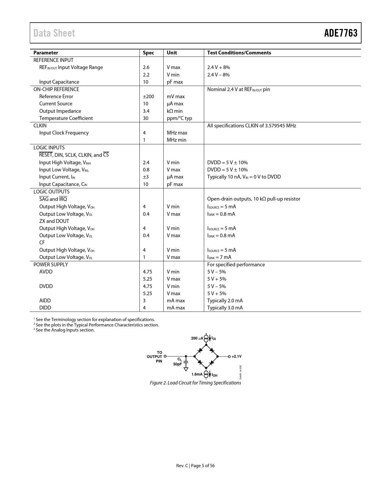 link to page 8 link to page 11 link to page 14 Data SheetADE7763ParameterSpecUnitTest Conditions/Comments REFERENCE INPUT REFIN/OUT Input Voltage Range 2.6 V max 2.4 V + 8% 2.2 V min 2.4 V – 8% Input Capacitance 10 pF max ON-CHIP REFERENCE Nominal 2.4 V at REFIN/OUT pin Reference Error ±200 mV max Current Source 10 µA max Output Impedance 3.4 kΩ min Temperature Coefficient 30 ppm/°C typ CLKIN All specifications CLKIN of 3.579545 MHz Input Clock Frequency 4 MHz max 1 MHz min LOGIC INPUTS RESET, DIN, SCLK, CLKIN, and CS Input High Voltage, VINH 2.4 V min DVDD = 5 V ± 10% Input Low Voltage, VINL 0.8 V max DVDD = 5 V ± 10% Input Current, IIN ±3 µA max Typically 10 nA, VIN = 0 V to DVDD Input Capacitance, CIN 10 pF max LOGIC OUTPUTS SAG and IRQ Open-drain outputs, 10 kΩ pull-up resistor Output High Voltage, VOH 4 V min ISOURCE = 5 mA Output Low Voltage, VOL 0.4 V max ISINK = 0.8 mA ZX and DOUT Output High Voltage, VOH 4 V min ISOURCE = 5 mA Output Low Voltage, VOL 0.4 V max ISINK = 0.8 mA CF Output High Voltage, VOH 4 V min ISOURCE = 5 mA Output Low Voltage, VOL 1 V max ISINK = 7 mA POWER SUPPLY For specified performance AVDD 4.75 V min 5 V – 5% 5.25 V max 5 V + 5% DVDD 4.75 V min 5 V – 5% 5.25 V max 5 V + 5% AIDD 3 mA max Typically 2.0 mA DIDD 4 mA max Typically 3.0 mA 1 See the Terminology section for explanation of specifications. 2 See the plots in the Typical Performance Characteristics section. 3 See the Analog Inputs section. 200 µ AIOlTOOUTPUT+2.1VCLPIN50pF1.6mAIOH 04481-A-002 Figure 2. Load Circuit for Timing Specifications Rev. C | Page 5 of 56 Document Outline Features General Description Functional Block Diagram Revision History Specifications Timing Characteristics Absolute Maximum Ratings ESD Caution Terminology Pin Configuration and Function Descriptions Typical Performance Characteristics Theory of Operation Analog Inputs di/dt Current Sensor and Digital Integrator Zero-Crossing Detection Zero-Crossing Timeout Period Measurement Power Supply Monitor Line Voltage Sag Detection Sag Level Set Peak Detection Peak Level Set Peak Level Record Interrupts Using Interrupts with an MCU Interrupt Timing Temperature Measurement Analog-to-Digital Conversion Antialias Filter ADC Transfer Function Reference Circuit Channel 1 ADC Channel 1 Sampling Channel 1 RMS Calculation Channel 1 RMS Offset Compensation Channel 2 ADC Channel 2 Sampling Channel 2 RMS Calculation Channel 2 RMS Offset Compensation Phase Compensation Active Power Calculation Energy Calculation Integration Time under Steady Load Power Offset Calibration Energy-to-Frequency Conversion Line Cycle Energy Accumulation Mode Positive-Only Accumulation Mode No-Load Threshold Apparent Power Calculation Apparent Power Offset Calibration Apparent Energy Calculation Integration Times under Steady Load Line Apparent Energy Accumulation Energies Scaling Calibrating an Energy Meter Watt Gain Calibrating Watt Gain Using a Reference Meter Example Calibrating Watt Gain Using an Accurate Source Example Watt Offset Calibrating Watt Offset Using a Reference Meter Example Calibrating Watt Offset with an Accurate Source Example Phase Calibration Calibrating Phase Using a Reference Meter Example Calibrating Phase with an Accurate Source Example VRMS and IRMS Calibration Apparent Energy CLKIN Frequency Suspending Functionality Checksum Register Serial Interface ADE7763 Serial Write Operation Serial Read Operation Registers Register Descriptions Communication Register Mode Register (0x09) Outline Dimensions Ordering Guide CH1OS Register (0x0D) Outline Dimensions Ordering Guide