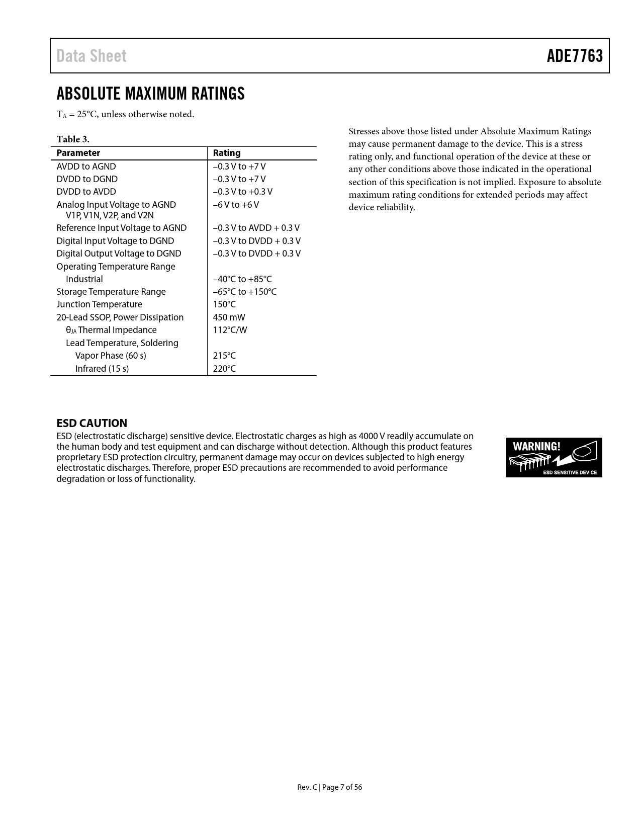 Data Sheet. ADE7763. ABSOLUTE MAXIMUM RATINGS. Table 3. Parameter. Rating. ESD CAUTION
