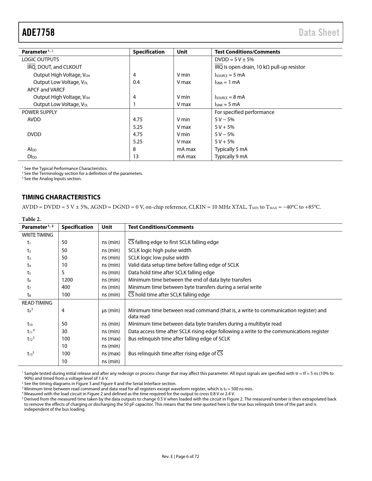 Pages / Page72 / 6 — ADE7758. Data Sheet. Parameter1,. Specification. Unit. Test …