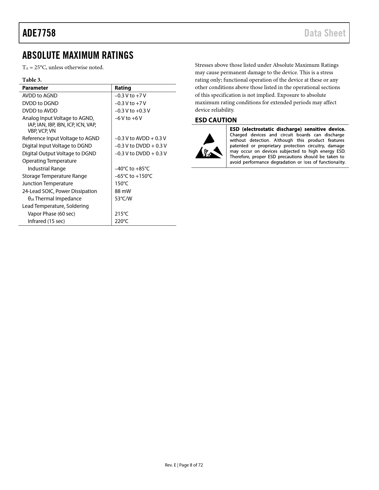 Pages / Page72 / 8 — ADE7758. Data Sheet. ABSOLUTE MAXIMUM RATINGS. Table 3. Parameter Rating. …
