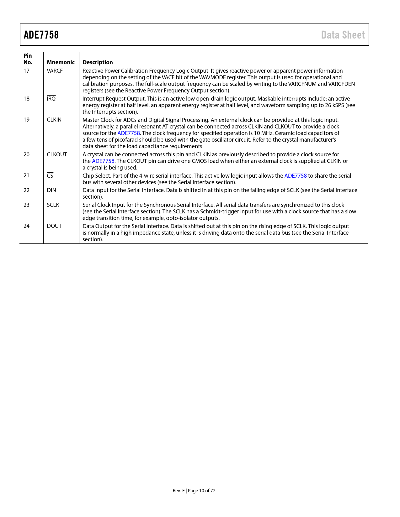link to page 38 link to page 55 link to page 56 link to page 56 link to page 56 link to page 56 ADE7758Data SheetPin No.MnemonicDescription 17 VARCF Reactive Power Calibration Frequency Logic Output. It gives reactive power or apparent power information depending on the setting of the VACF bit of the WAVMODE register. This output is used for operational and calibration purposes. The full-scale output frequency can be scaled by writing to the VARCFNUM and VARCFDEN registers (see the Reactive Power Frequency Output section). 18 IRQ Interrupt Request Output. This is an active low open-drain logic output. Maskable interrupts include: an active energy register at half level, an apparent energy register at half level, and waveform sampling up to 26 kSPS (see the Interrupts section). 19 CLKIN Master Clock for ADCs and Digital Signal Processing. An external clock can be provided at this logic input. Alternatively, a parallel resonant AT crystal can be connected across CLKIN and CLKOUT to provide a clock source for the ADE7758. The clock frequency for specified operation is 10 MHz. Ceramic load capacitors of a few tens of picofarad should be used with the gate oscillator circuit. Refer to the crystal manufacturer’s data sheet for the load capacitance requirements 20 CLKOUT A crystal can be connected across this pin and CLKIN as previously described to provide a clock source for the ADE7758. The CLKOUT pin can drive one CMOS load when either an external clock is supplied at CLKIN or a crystal is being used. 21 CS Chip Select. Part of the 4-wire serial interface. This active low logic input allows the ADE7758 to share the serial bus with several other devices (see the Serial Interface section). 22 DIN Data Input for the Serial Interface. Data is shifted in at this pin on the falling edge of SCLK (see the Serial Interface section). 23 SCLK Serial Clock Input for the Synchronous Serial Interface. All serial data transfers are synchronized to this clock (see the Serial Interface section). The SCLK has a Schmidt-trigger input for use with a clock source that has a slow edge transition time, for example, opto-isolator outputs. 24 DOUT Data Output for the Serial Interface. Data is shifted out at this pin on the rising edge of SCLK. This logic output is normally in a high impedance state, unless it is driving data onto the serial data bus (see the Serial Interface section). Rev. E | Page 10 of 72 Document Outline FEATURES GENERAL DESCRIPTION FUNCTIONAL BLOCK DIAGRAM TABLE OF CONTENTS GENERAL DESCRIPTION SPECIFICATIONS TIMING CHARACTERISTICS TIMING DIAGRAMS ABSOLUTE MAXIMUM RATINGS ESD CAUTION PIN CONFIGURATION AND FUNCTION DESCRIPTIONS TERMINOLOGY TYPICAL PERFORMANCE CHARACTERISTICS TEST CIRCUITS THEORY OF OPERATION ANTIALIASING FILTER ANALOG INPUTS CURRENT CHANNEL ADC Current Channel Sampling di/dt CURRENT SENSOR AND DIGITAL INTEGRATOR PEAK CURRENT DETECTION Peak Current Detection Using the PEAK Register OVERCURRENT DETECTION INTERRUPT VOLTAGE CHANNEL ADC Voltage Channel Sampling ZERO-CROSSING DETECTION Zero-Crossing Timeout PHASE COMPENSATION PERIOD MEASUREMENT LINE VOLTAGE SAG DETECTION SAG LEVEL SET PEAK VOLTAGE DETECTION Peak Voltage Detection Using the VPEAK Register Overvoltage Detection Interrupt PHASE SEQUENCE DETECTION POWER-SUPPLY MONITOR REFERENCE CIRCUIT TEMPERATURE MEASUREMENT ROOT MEAN SQUARE MEASUREMENT Current RMS Calculation Current RMS Offset Compensation Voltage Channel RMS Calculation Voltage RMS Offset Compensation Voltage RMS Gain Adjust ACTIVE POWER CALCULATION Active Power Gain Calibration Active Power Offset Calibration Sign of Active Power Calculation No-Load Threshold Active Energy Calculation Integration Time Under Steady Load Energy Accumulation Mode Active Power Frequency Output Line Cycle Active Energy Accumulation Mode REACTIVE POWER CALCULATION Reactive Power Gain Calibration Reactive Power Offset Calibration Sign of Reactive Power Calculation Reactive Energy Calculation Integration Time Under Steady Load Energy Accumulation Mode Reactive Power Frequency Output Line Cycle Reactive Energy Accumulation Mode APPARENT POWER CALCULATION Apparent Power Gain Calibration Apparent Power Offset Calibration Apparent Energy Calculation Integration Time Under Steady Load Energy Accumulation Mode Apparent Power Frequency Output Line Cycle Apparent Energy Accumulation Mode ENERGY REGISTERS SCALING WAVEFORM SAMPLING MODE CALIBRATION Calibration Using Pulse Output Gain Calibration Using Pulse Output Example: Watt Gain Calibration of Phase A Using Pulse Output Phase Calibration Using Pulse Output Example: Phase Calibration of Phase A Using Pulse Output Power Offset Calibration Using Pulse Output Example: Offset Calibration of Phase A Using Pulse Output Calibration Using Line Accumulation Gain Calibration Using Line Accumulation Example: Watt Gain Calibration Using Line Accumulation Phase Calibration Using Line Accumulation Example: Phase Calibration Using Line Accumulation Power Offset Calibration Using Line Accumulation Example: Power Offset Calibration Using Line Accumulation Calibration of IRMS and VRMS Offset Example: Calibration of RMS Offsets CHECKSUM REGISTER INTERRUPTS USING THE INTERRUPTS WITH AN MCU INTERRUPT TIMING SERIAL INTERFACE SERIAL WRITE OPERATION SERIAL READ OPERATION ACCESSING THE ON-CHIP REGISTERS REGISTERS COMMUNICATIONS REGISTER OPERATIONAL MODE REGISTER (0x13) MEASUREMENT MODE REGISTER (0x14) WAVEFORM MODE REGISTER (0x15) COMPUTATIONAL MODE REGISTER (0x16) LINE CYCLE ACCUMULATION MODE REGISTER (0x17) INTERRUPT MASK REGISTER (0x18) INTERRUPT STATUS REGISTER (0x19)/RESET INTERRUPT STATUS REGISTER (0x1A) OUTLINE DIMENSIONS ORDERING GUIDE