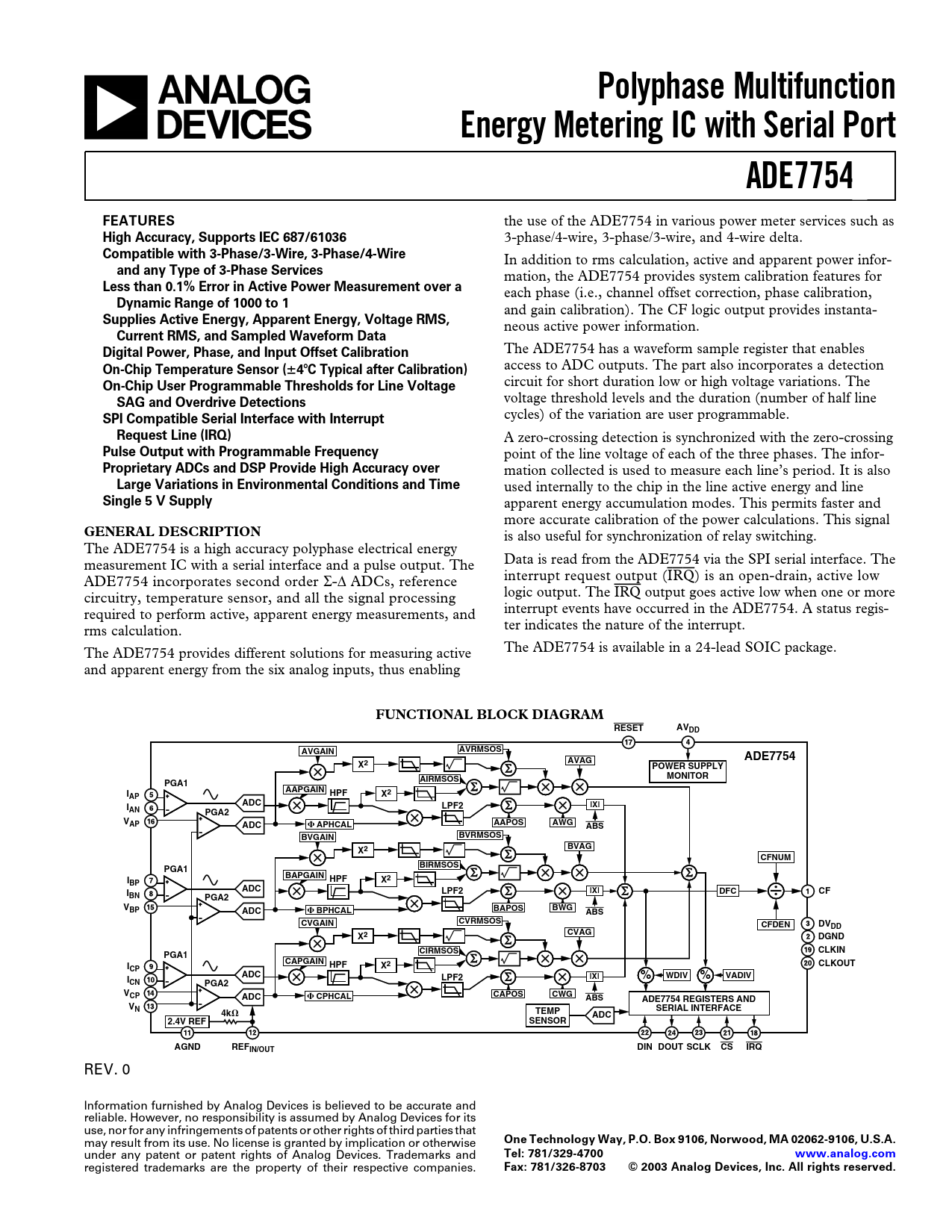 Polyphase Multifunction. Energy Metering IC with Serial Port. ADE7754. FEATURES. High Accuracy, Supports IEC 687/61036