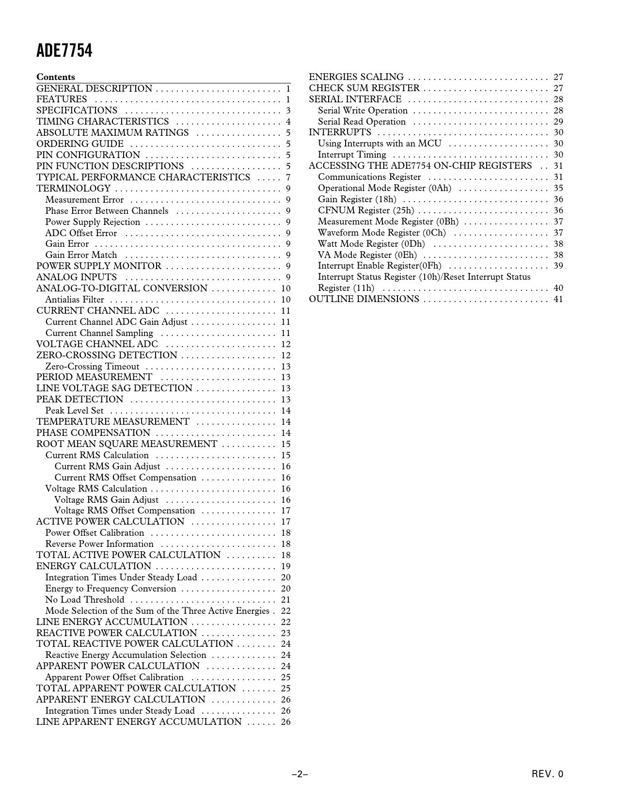 link to page 1 link to page 1 link to page 3 link to page 4 link to page 5 link to page 5 link to page 5 link to page 5 link to page 7 link to page 9 link to page 9 link to page 9 link to page 9 link to page 9 link to page 9 link to page 9 link to page 9 link to page 9 link to page 10 link to page 10 link to page 11 link to page 11 link to page 12 link to page 12 link to page 13 link to page 13 link to page 13 link to page 13 link to page 14 link to page 14 link to page 14 link to page 15 link to page 15 link to page 16 link to page 16 link to page 16 link to page 17 link to page 17 link to page 18 link to page 18 link to page 18 link to page 19 link to page 20 link to page 20 link to page 21 link to page 22 link to page 22 link to page 23 link to page 24 link to page 24 link to page 24 link to page 25 link to page 25 link to page 26 link to page 26 link to page 26 link to page 27 link to page 27 link to page 28 link to page 28 link to page 29 link to page 30 link to page 30 link to page 30 link to page 31 link to page 31 link to page 35 link to page 36 link to page 36 link to page 37 link to page 37 link to page 38 link to page 38 link to page 39 link to page 40 link to page 41 link to page 40 link to page 11 link to page 16 ADE7754Contents ENERGIES SCALING . 27 GENERAL DESCRIPTION . 1 CHECK SUM REGISTER . 27 FEATURES . 1 SERIAL INTERFACE . 28 SPECIFICATIONS . 3 Serial Write Operation . 28 TIMING CHARACTERISTICS . 4 Serial Read Operation . 29 ABSOLUTE MAXIMUM RATINGS . 5 INTERRUPTS . 30 ORDERING GUIDE . 5 Using Interrupts with an MCU . 30 PIN CONFIGURATION . 5 Interrupt Timing . 30 PIN FUNCTION DESCRIPTIONS . 5 ACCESSING THE ADE7754 ON-CHIP REGISTERS . 31 TYPICAL PERFORMANCE CHARACTERISTICS . 7 Communications Register . 31 TERMINOLOGY . 9 Operational Mode Register (0Ah) . 35 Measurement Error . 9 Gain Register (18h) . 36 Phase Error Between Channels . 9 CFNUM Register (25h) . 36 Power Supply Rejection . 9 Measurement Mode Register (0Bh) . 37 ADC Offset Error . 9 Waveform Mode Register (0Ch) . 37 Gain Error . 9 Watt Mode Register (0Dh) . 38 Gain Error Match . 9 VA Mode Register (0Eh) . 38 POWER SUPPLY MONITOR . 9 Interrupt Enable Register(0Fh) . 39 ANALOG INPUTS . 9 Interrupt Status Register (10h)/Reset Interrupt Status ANALOG-TO-DIGITAL CONVERSION . 10 Register (11h) . 40 Antialias Filter . 10 OUTLINE DIMENSIONS . 41 CURRENT CHANNEL ADC . 11 Current Channel ADC Gain Adjust . 11 Current Channel Sampling . 11 VOLTAGE CHANNEL ADC . 12 ZERO-CROSSING DETECTION . 12 Zero-Crossing Timeout . 13 PERIOD MEASUREMENT . 13 LINE VOLTAGE SAG DETECTION . 13 PEAK DETECTION . 13 Peak Level Set . 14 TEMPERATURE MEASUREMENT . 14 PHASE COMPENSATION . 14 ROOT MEAN SQUARE MEASUREMENT . 15 Current RMS Calculation . 15 Current RMS Gain Adjust . 16 Current RMS Offset Compensation . 16 Voltage RMS Calculation . 16 Voltage RMS Gain Adjust . 16 Voltage RMS Offset Compensation . 17 ACTIVE POWER CALCULATION . 17 Power Offset Calibration . 18 Reverse Power Information . 18 TOTAL ACTIVE POWER CALCULATION . 18 ENERGY CALCULATION . 19 Integration Times Under Steady Load . 20 Energy to Frequency Conversion . 20 No Load Threshold . 21 Mode Selection of the Sum of the Three Active Energies . 22 LINE ENERGY ACCUMULATION . 22 REACTIVE POWER CALCULATION . 23 TOTAL REACTIVE POWER CALCULATION . 24 Reactive Energy Accumulation Selection . 24 APPARENT POWER CALCULATION . 24 Apparent Power Offset Calibration . 25 TOTAL APPARENT POWER CALCULATION . 25 APPARENT ENERGY CALCULATION . 26 Integration Times under Steady Load . 26 LINE APPARENT ENERGY ACCUMULATION . 26 –2– REV. 0 Document Outline FEATURES GENERAL DESCRIPTION FUNCTIONAL BLOCK DIAGRAM SPECIFICATIONS TIMING CHARACTERISTICS ABSOLUTE MAXIMUM RATINGS ORDERING GUIDE PIN CONFIGURATION PIN FUNCTION DESCRIPTIONS Typical Performance Characteristics TERMINOLOGY Measurement Error Phase Error Between Channels Power Supply Rejection ADC Offset Error Gain Error Gain Error Match POWER SUPPLY MONITOR ANALOG INPUTS ANALOG-TO-DIGITAL CONVERSION Antialias Filter CURRENT CHANNEL ADC Current Channel ADC Gain Adjust Current Channel Sampling VOLTAGE CHANNEL ADC ZERO-CROSSING DETECTION Zero-Crossing Timeout PERIOD MEASUREMENT LINE VOLTAGE SAG DETECTION SAG Level Set PEAK DETECTION Peak Level Set TEMPERATURE MEASUREMENT PHASE COMPENSATION ROOT MEAN SQUARE MEASUREMENT Current RMS Calculation Current RMS Gain Adjust Current RMS Offset Compensation Voltage RMS Calculation Voltage RMS Gain Adjust Voltage RMS Offset Compensation ACTIVE POWER CALCULATION Power Offset Calibration Reverse Power Information TOTAL ACTIVE POWER CALCULATION ENERGY CALCULATION Integration Times Under Steady Load Energy to Frequency Conversion No Load Threshold Mode Selection of the Sum of the Three Active Energies LINE ENERGY ACCUMULATION REACTIVE POWER CALCULATION TOTAL REACTIVE POWER CALCULATION Reactive Energy Accumulation Selection APPARENT POWER CALCULATION Apparent Power Offset Calibration TOTAL APPARENT POWER CALCULATION APPARENT ENERGY CALCULATION Integration Times under Steady Load LINE APPARENT ENERGY ACCUMULATION ENERGIES SCALING CHECK SUM REGISTER SERIAL INTERFACE Serial Write Operation Serial Read Operation INTERRUPTS Using Interrupts with an MCU Interrupt Timing ACCESSING THE ADE7754 ON-CHIP REGISTERS Communications Register Operational Mode Register (0Ah) Gain Register (18h) CFNUM Register (25h) Measurement Mode Register (0Bh) Waveform Mode Register (0Ch) Watt Mode Register (0Dh) VA Mode Register (0Eh) Interrupt Enable Register (0Fh) Interrupt Status Register (10h)/Reset Interrupt Status Register (11h) OUTLINE DIMENSIONS