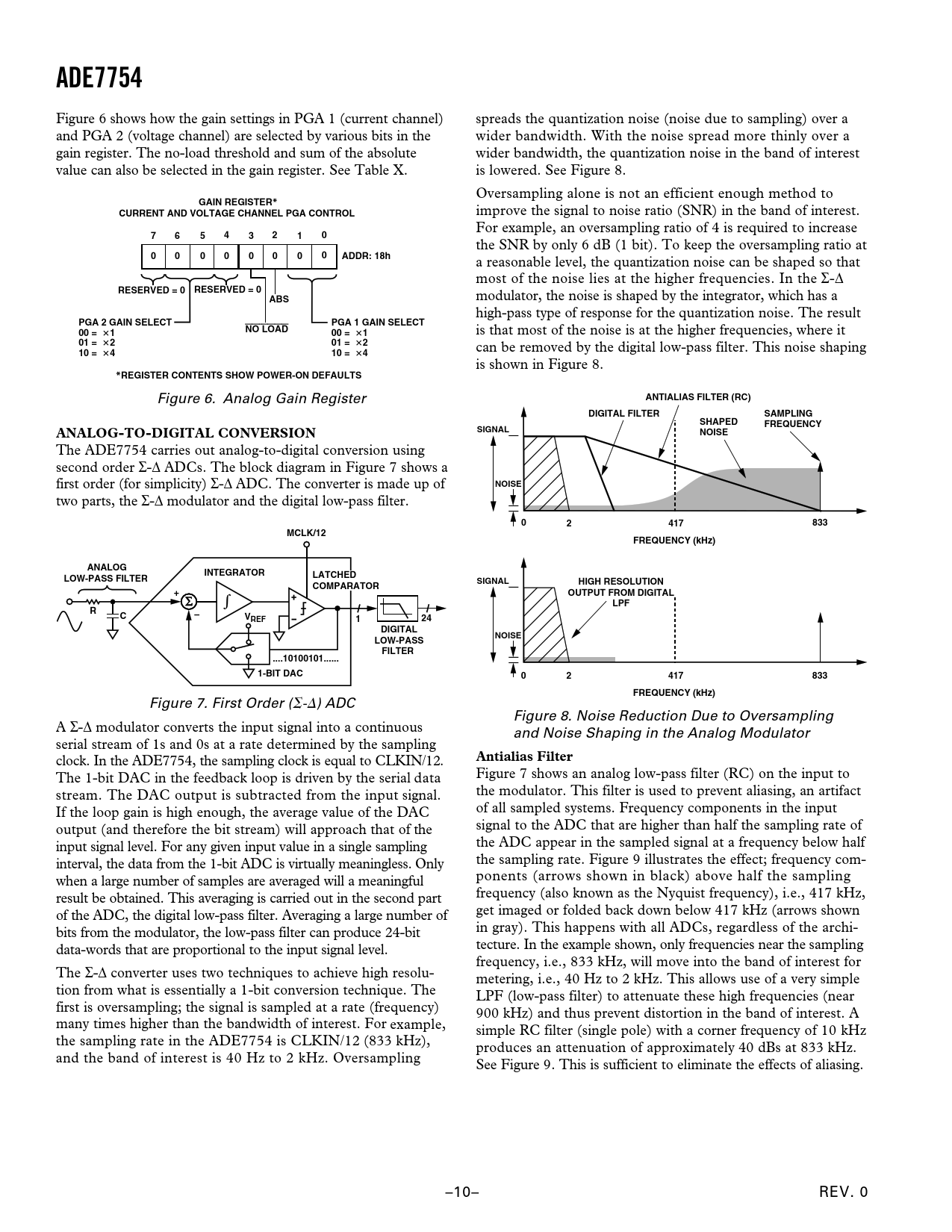 The ADE7754 carries out analog-to-digital conversion using second order Σ-∆ ADCs. The block diagram in Figure 7 shows a first order (for simplicity) Σ-∆ ADC. The converter is made up of