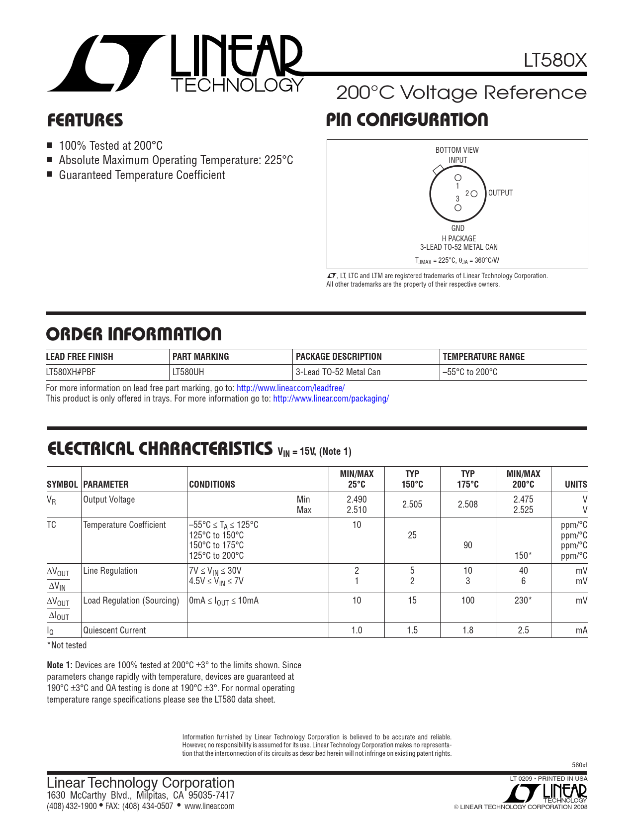 n 100% Tested at 200°C BOTTOM VIEW n INPUT Absolute Maximum Operating Temperature: 225°C n Guaranteed Temperature Coeffi cient 1 2 OUTPUT 3 GND H PACKAGE 3-LEAD TO-52 METAL CAN TJMAX = 225°C, θJA = 360°C/W L, LT, LTC and LTM are registered trademarks of Linear Technology Corporation. All other trademarks are the property of their respective owners.