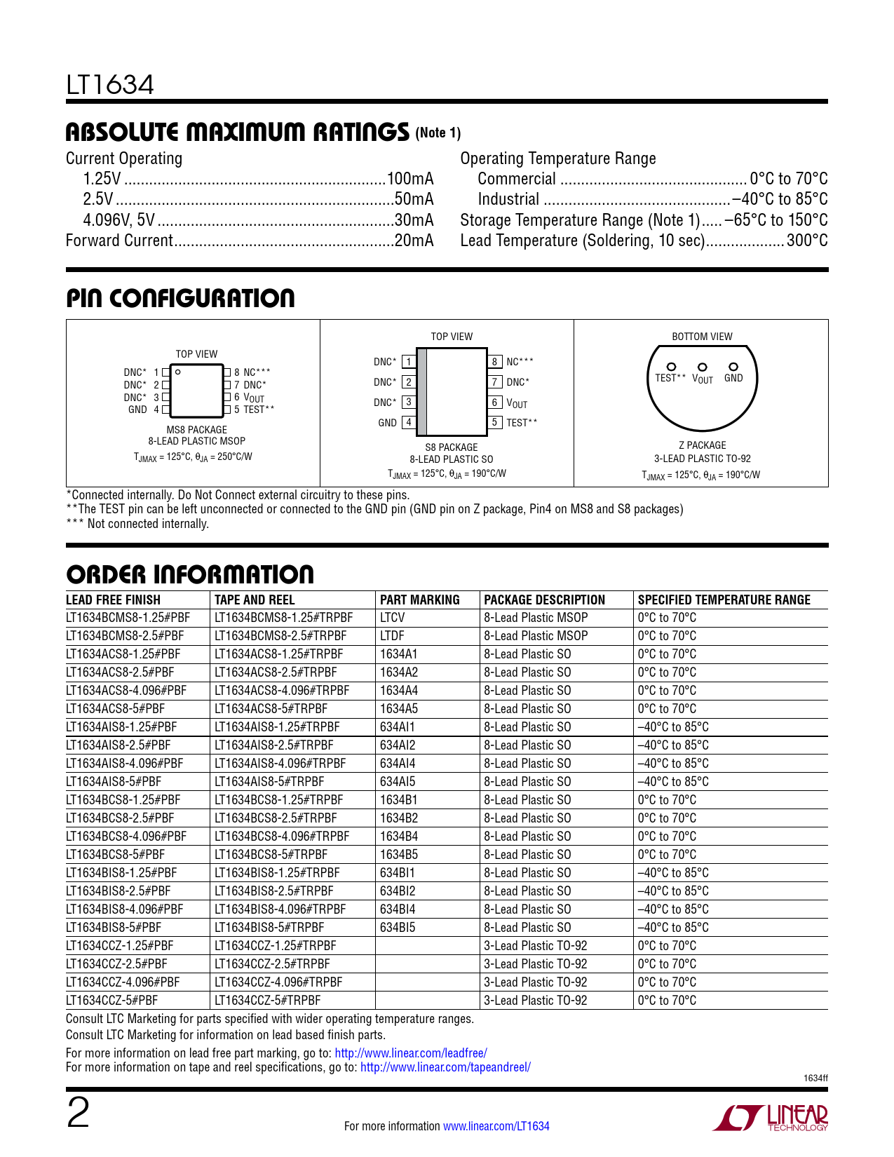 LT1634 absoluTe MaxiMuM raTings (Note 1) Current Operating Operating Temperature Range 1.25V ...100mA Commercial ... 0°C to 70°C 2.5V ...50mA Industrial ...–40°C to 85°C 4.096V, 5V ...30mA Storage Temperature Range (Note 1) ... –65°C to 150°C Forward Current ...20mA Lead Temperature (Soldering, 10 sec) ...300°C pin conFiguraTion TOP VIEW BOTTOM VIEW TOP VIEW DNC* 1 8 NC*** DNC* 1 8 NC*** TEST** V DNC* 2 7 DNC* DNC* 2 7 DNC* OUT GND DNC* 3 6 VOUT DNC* 3 6 V GND 4 5 TEST** OUT GND 4 5 TEST** MS8 PACKAGE 8-LEAD PLASTIC MSOP S8 PACKAGE Z PACKAGE TJMAX = 125°C, θJA = 250°C/W 8-LEAD PLASTIC SO 3-LEAD PLASTIC TO-92 TJMAX = 125°C, θJA = 190°C/W TJMAX = 125°C, θJA = 190°C/W *Connected internally. Do Not Connect external circuitry to these pins. **The TEST pin can be left unconnected or connected to the GND pin (GND pin on Z package, Pin4 on MS8 and S8 packages) *** Not connected internally. orDer inForMaTion LEAD FREE FINISHTAPE AND REELPART MARKINGPACKAGE DESCRIPTIONSPECIFIED TEMPERATURE RANGE LT1634BCMS8-1.25#PBF LT1634BCMS8-1.25#TRPBF LTCV 8-Lead Plastic MSOP 0°C to 70°C LT1634BCMS8-2.5#PBF LT1634BCMS8-2.5#TRPBF LTDF 8-Lead Plastic MSOP 0°C to 70°C LT1634ACS8-1.25#PBF LT1634ACS8-1.25#TRPBF 1634A1 8-Lead Plastic SO 0°C to 70°C LT1634ACS8-2.5#PBF LT1634ACS8-2.5#TRPBF 1634A2 8-Lead Plastic SO 0°C to 70°C LT1634ACS8-4.096#PBF LT1634ACS8-4.096#TRPBF 1634A4 8-Lead Plastic SO 0°C to 70°C LT1634ACS8-5#PBF LT1634ACS8-5#TRPBF 1634A5 8-Lead Plastic SO 0°C to 70°C LT1634AIS8-1.25#PBF LT1634AIS8-1.25#TRPBF 634AI1 8-Lead Plastic SO –40°C to 85°C LT1634AIS8-2.5#PBF LT1634AIS8-2.5#TRPBF 634AI2 8-Lead Plastic SO –40°C to 85°C LT1634AIS8-4.096#PBF LT1634AIS8-4.096#TRPBF 634AI4 8-Lead Plastic SO –40°C to 85°C LT1634AIS8-5#PBF LT1634AIS8-5#TRPBF 634AI5 8-Lead Plastic SO –40°C to 85°C LT1634BCS8-1.25#PBF LT1634BCS8-1.25#TRPBF 1634B1 8-Lead Plastic SO 0°C to 70°C LT1634BCS8-2.5#PBF LT1634BCS8-2.5#TRPBF 1634B2 8-Lead Plastic SO 0°C to 70°C LT1634BCS8-4.096#PBF LT1634BCS8-4.096#TRPBF 1634B4 8-Lead Plastic SO 0°C to 70°C LT1634BCS8-5#PBF LT1634BCS8-5#TRPBF 1634B5 8-Lead Plastic SO 0°C to 70°C LT1634BIS8-1.25#PBF LT1634BIS8-1.25#TRPBF 634BI1 8-Lead Plastic SO –40°C to 85°C LT1634BIS8-2.5#PBF LT1634BIS8-2.5#TRPBF 634BI2 8-Lead Plastic SO –40°C to 85°C LT1634BIS8-4.096#PBF LT1634BIS8-4.096#TRPBF 634BI4 8-Lead Plastic SO –40°C to 85°C LT1634BIS8-5#PBF LT1634BIS8-5#TRPBF 634BI5 8-Lead Plastic SO –40°C to 85°C LT1634CCZ-1.25#PBF LT1634CCZ-1.25#TRPBF 3-Lead Plastic TO-92 0°C to 70°C LT1634CCZ-2.5#PBF LT1634CCZ-2.5#TRPBF 3-Lead Plastic TO-92 0°C to 70°C LT1634CCZ-4.096#PBF LT1634CCZ-4.096#TRPBF 3-Lead Plastic TO-92 0°C to 70°C LT1634CCZ-5#PBF LT1634CCZ-5#TRPBF 3-Lead Plastic TO-92 0°C to 70°C Consult LTC Marketing for parts specified with wider operating temperature ranges. Consult LTC Marketing for information on lead based finish parts. For more information on lead free part marking, go to: http://www.linear.com/leadfree/ For more information on tape and reel specifications, go to: http://www.linear.com/tapeandreel/ 1634ff 2 For more information www.linear.com/LT1634 Document Outline Features Description Applications Typical Application Absolute Maximum Ratings Applications Information Typical Application Related Parts