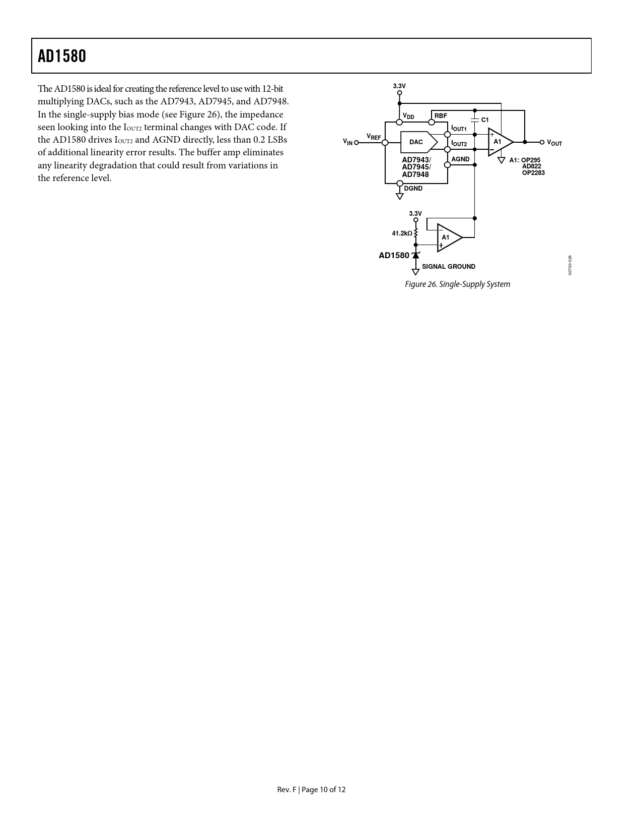link to page 10 AD1580 The AD1580 is ideal for creating the reference level to use with 12-bit 3.3V multiplying DACs, such as the AD7943, AD7945, and AD7948. In the single-supply bias mode (see Figure 26), the impedance VDDRBFC1 seen looking into the IOUT2 terminal changes with DAC code. If IOUT1 the AD1580 drives I V OUT2 and AGND directly, less than 0.2 LSBs REFVINDACIA1OUT2VOUT of additional linearity error results. The buffer amp eliminates any linearity degradation that could result from variations in AD7943/AGNDA1: OP295AD7945/AD822 the reference level. OP2283AD7948DGND3.3V41.2kΩA1AD1580 026 SIGNAL GROUND 00700- Figure 26. Single-Supply System Rev. F | Page 10 of 12 Document Outline Features Applications General Description Pin Configurations Revision History Specifications Absolute Maximum Ratings ESD Caution Typical Performance Characteristics Theory of Operation Applying the AD1580 Temperature Performance Voltage Output Nonlinearity vs. Temperature Reverse Voltage Hysteresis Output Impedance vs. Frequency Noise Performance and Reduction Turn-On Time Transient Response Precision Micropower Low Dropout Reference Using the AD1580 with 3 V Data Converters Outline Dimensions Ordering Guide Package Branding Information