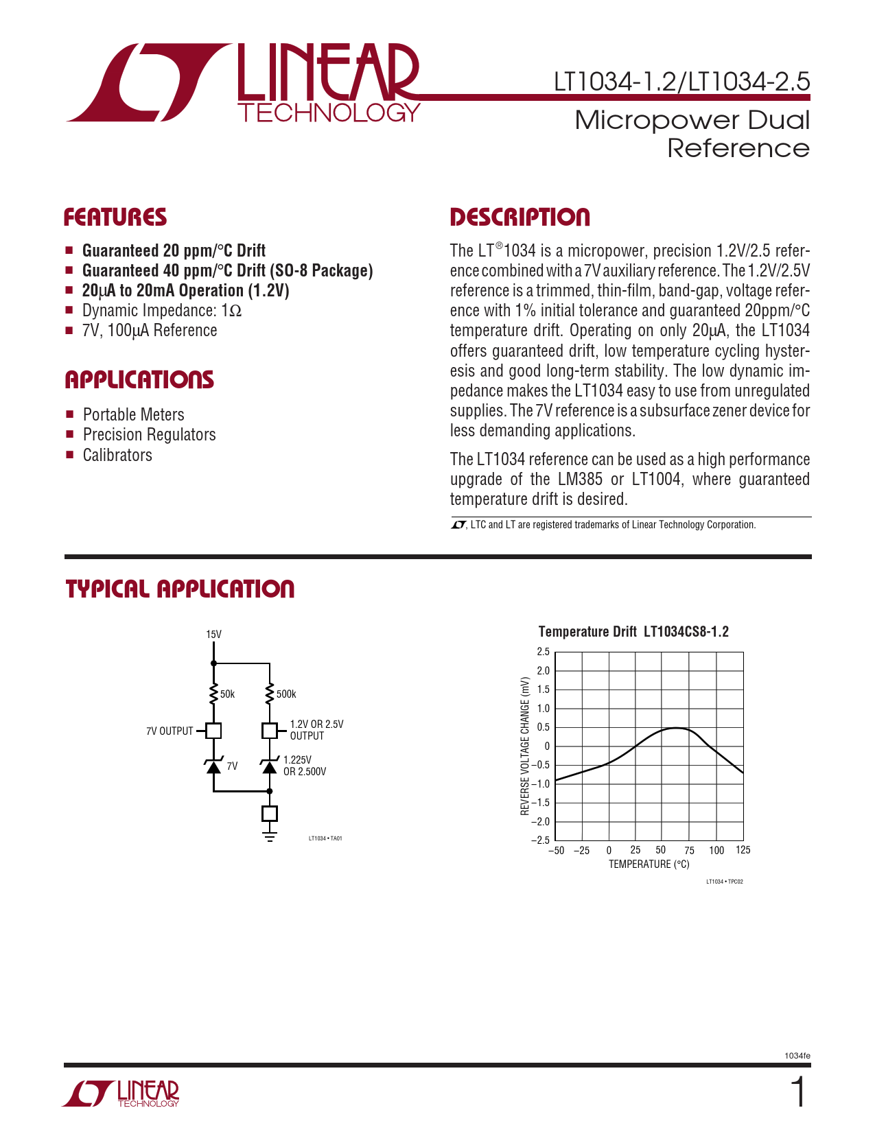LT1034-1.2/LT1034-2.5 Micropower Dual Reference UFEATURESDESCRIPTIO ■ Guaranteed 20 ppm/ ° C Drift The LT®1034 is a micropower, precision 1.2V/2.5 refer- ■ Guaranteed 40 ppm/ ° C Drift (SO-8 Package) ence combined with a 7V auxiliary reference. The 1.2V/2.5V ■ 20 µ A to 20mA Operation (1.2V) reference is a trimmed, thin-film, band-gap, voltage refer- ■ Dynamic Impedance: 1Ω ence with 1% initial tolerance and guaranteed 20ppm/°C ■ 7V, 100µA Reference temperature drift. Operating on only 20µA, the LT1034 offers guaranteed drift, low temperature cycling hyster- UAPPLICATIO S esis and good long-term stability. The low dynamic im- pedance makes the LT1034 easy to use from unregulated ■ supplies. The 7V reference is a subsurface zener device for Portable Meters ■ less demanding applications. Precision Regulators ■ Calibrators The LT1034 reference can be used as a high performance upgrade of the LM385 or LT1004, where guaranteed temperature drift is desired. , LTC and LT are registered trademarks of Linear Technology Corporation. UTYPICAL APPLICATIO 15V Temperature Drift LT1034CS8-1.2 2.5 2.0 1.5 50k 500k 1.0 1.2V OR 2.5V 0.5 7V OUTPUT OUTPUT 0 1.225V 7V –0.5 OR 2.500V –1.0 –1.5 REVERSE VOLTAGE CHANGE (mV) –2.0 LT1034 • TA01 –2.5 –50 –25 0 25 50 75 100 125 TEMPERATURE (°C) LT1034 • TPC02 1034fe 1