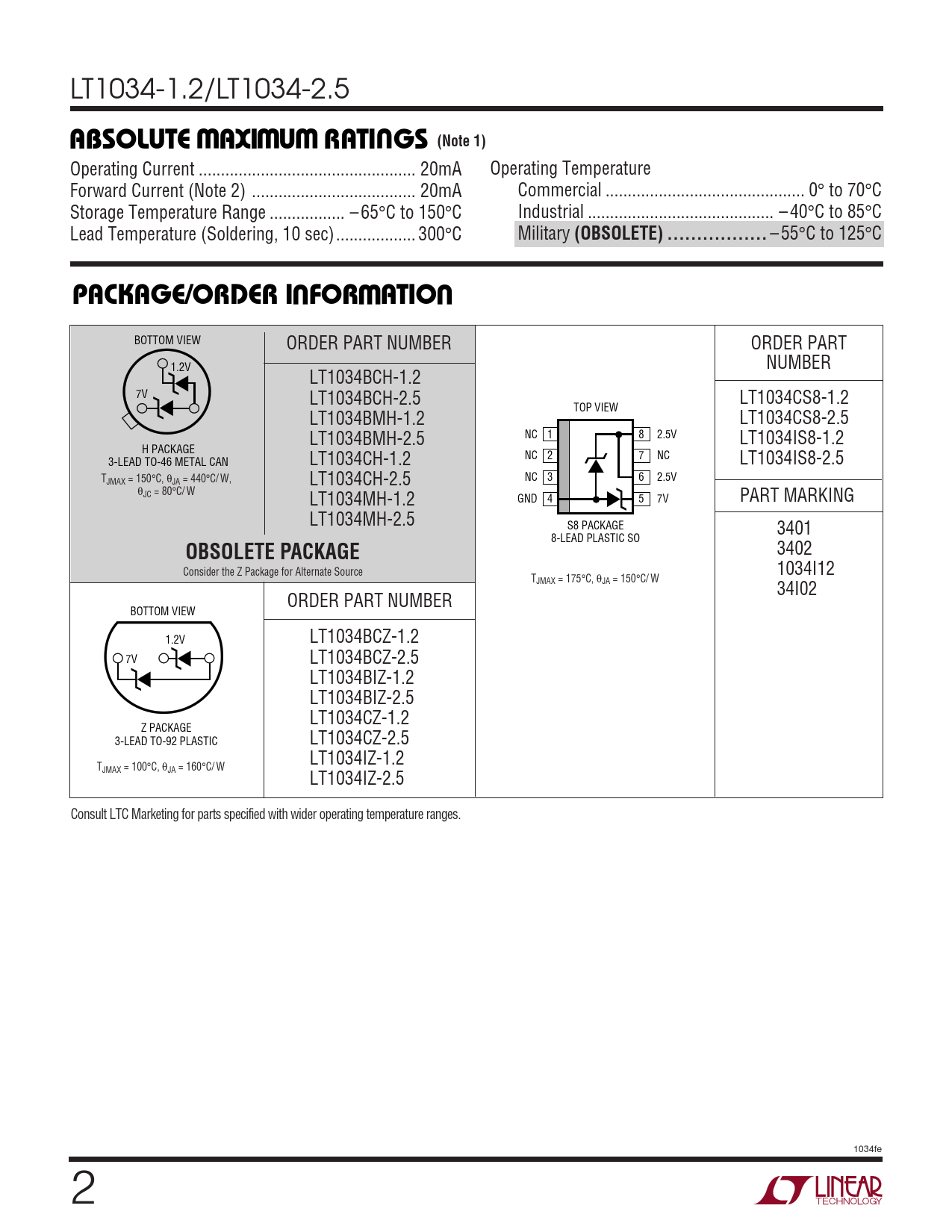 LT1034-1.2/LT1034-2.5 WWWUABSOLUTE MAXIMUM RATINGS (Note 1) Operating Current ... 20mA Operating Temperature Forward Current (Note 2) ... 20mA Commercial ... 0° to 70°C Storage Temperature Range ... – 65°C to 150°C Industrial .. – 40°C to 85°C Lead Temperature (Soldering, 10 sec).. 300°C Military (OBSOLETE) ... – 55°C to 125°C UWUPACKAGE/ORDER INFORMATION BOTTOM VIEW ORDER PART NUMBER ORDER PART 1.2V NUMBER LT1034BCH-1.2 7V LT1034BCH-2.5 LT1034CS8-1.2 TOP VIEW LT1034BMH-1.2 LT1034CS8-2.5 NC 1 8 2.5V LT1034BMH-2.5 LT1034IS8-1.2 H PACKAGE NC 2 7 NC 3-LEAD TO-46 METAL CAN LT1034CH-1.2 LT1034IS8-2.5 T NC 2.5V JMAX = 150°C, θJA = 440°C/ W, 3 6 LT1034CH-2.5 θJC = 80°C/ W GND 4 5 7V LT1034MH-1.2 PART MARKING LT1034MH-2.5 S8 PACKAGE 3401 8-LEAD PLASTIC SO 3402 OBSOLETE PACKAGE Consider the Z Package for Alternate Source 1034I12 TJMAX = 175°C, θJA = 150°C/ W 34I02 ORDER PART NUMBER BOTTOM VIEW 1.2V LT1034BCZ-1.2 7V LT1034BCZ-2.5 LT1034BIZ-1.2 LT1034BIZ-2.5 LT1034CZ-1.2 Z PACKAGE 3-LEAD TO-92 PLASTIC LT1034CZ-2.5 LT1034IZ-1.2 TJMAX = 100°C, θJA = 160°C/ W LT1034IZ-2.5 Consult LTC Marketing for parts specified with wider operating temperature ranges. 1034fe 2