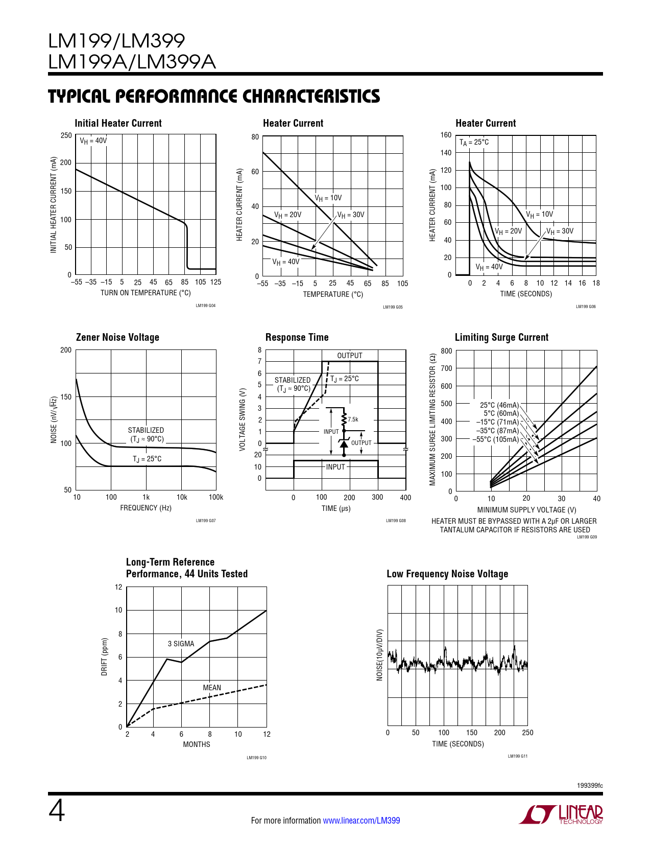 12 10 8 3 SIGMA 6 DRIFT (ppm) 4 NOISE(10µV/DIV) MEAN 2 0 2 4 6 8 10 12 0 50 100 150 200 250 MONTHS TIME (SECONDS) LM199 G10 LM199 G11 199399fc 4 For more information www.linear.com/LM399 Document Outline Features Description Applications Typical Application Absolute Maximum Ratings Pin Configuration Order Information Electrical Characteristics Typical Performance Characteristics Functional Block Diagram Typical Applications Schematic Diagrams Package Description Revision History Related Parts