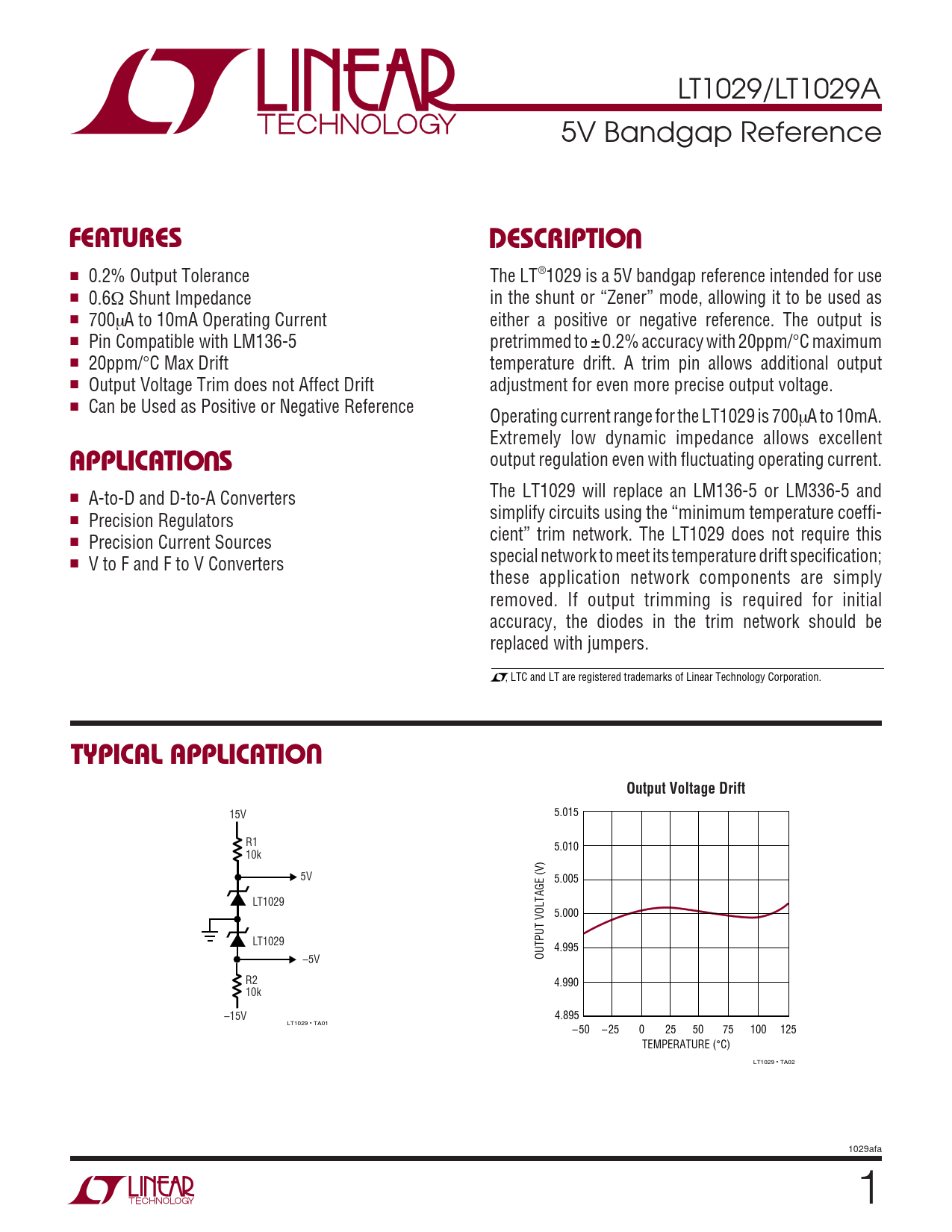 The LT1029 will replace an LM136-5 or LM336-5 and ■ A-to-D and D-to-A Converters simplify circuits using the “minimum temperature coeffi- ■ Precision Regulators cient” trim network. The LT1029 does not require this ■ Precision Current Sources special network to meet its temperature drift specification; ■ V to F and F to V Converters these application network components are simply removed. If output trimming is required for initial accuracy, the diodes in the trim network should be replaced with jumpers. , LTC and LT are registered trademarks of Linear Technology Corporation.