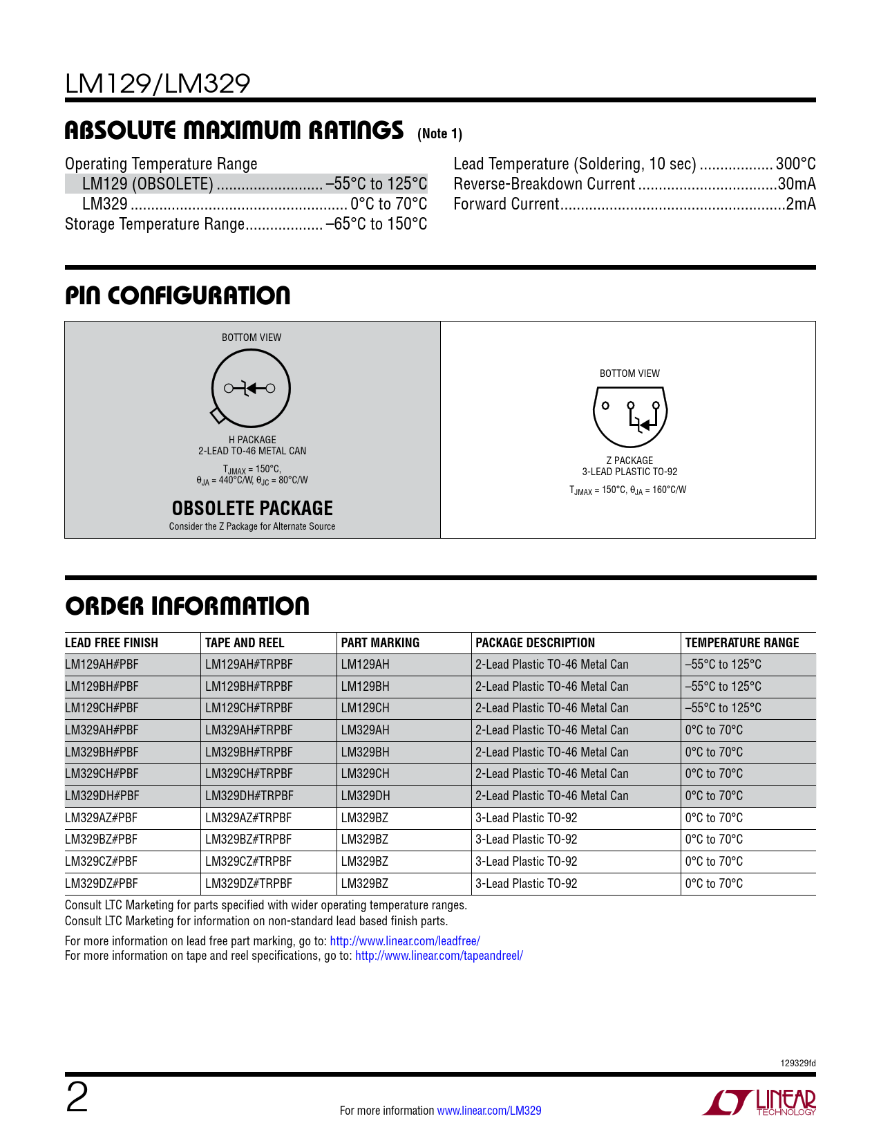 LM129AH#PBF LM129AH#TRPBF LM129AH 2-Lead Plastic TO-46 Metal Can –55°C to 125°C LM129BH#PBF LM129BH#TRPBF LM129BH 2-Lead Plastic TO-46 Metal Can –55°C to 125°C LM129CH#PBF LM129CH#TRPBF LM129CH 2-Lead Plastic TO-46 Metal Can –55°C to 125°C LM329AH#PBF LM329AH#TRPBF LM329AH 2-Lead Plastic TO-46 Metal Can 0°C to 70°C LM329BH#PBF LM329BH#TRPBF LM329BH 2-Lead Plastic TO-46 Metal Can 0°C to 70°C LM329CH#PBF LM329CH#TRPBF LM329CH 2-Lead Plastic TO-46 Metal Can 0°C to 70°C LM329DH#PBF LM329DH#TRPBF LM329DH 2-Lead Plastic TO-46 Metal Can 0°C to 70°C LM329AZ#PBF LM329AZ#TRPBF LM329BZ 3-Lead Plastic TO-92 0°C to 70°C LM329BZ#PBF LM329BZ#TRPBF LM329BZ 3-Lead Plastic TO-92 0°C to 70°C LM329CZ#PBF LM329CZ#TRPBF LM329BZ 3-Lead Plastic TO-92 0°C to 70°C LM329DZ#PBF LM329DZ#TRPBF LM329BZ 3-Lead Plastic TO-92 0°C to 70°C Consult LTC Marketing for parts specified with wider operating temperature ranges. Consult LTC Marketing for information on non-standard lead based finish parts. For more information on lead free part marking, go to: http://www.linear.com/leadfree/ For more information on tape and reel specifications, go to: http://www.linear.com/tapeandreel/ 129329fd 2 For more information www.linear.com/LM329 Document Outline Description Typical Application Absolute Maximum Ratings Electrical Characteristics Typical Performance Characteristics Package Description Typical Application Related Parts