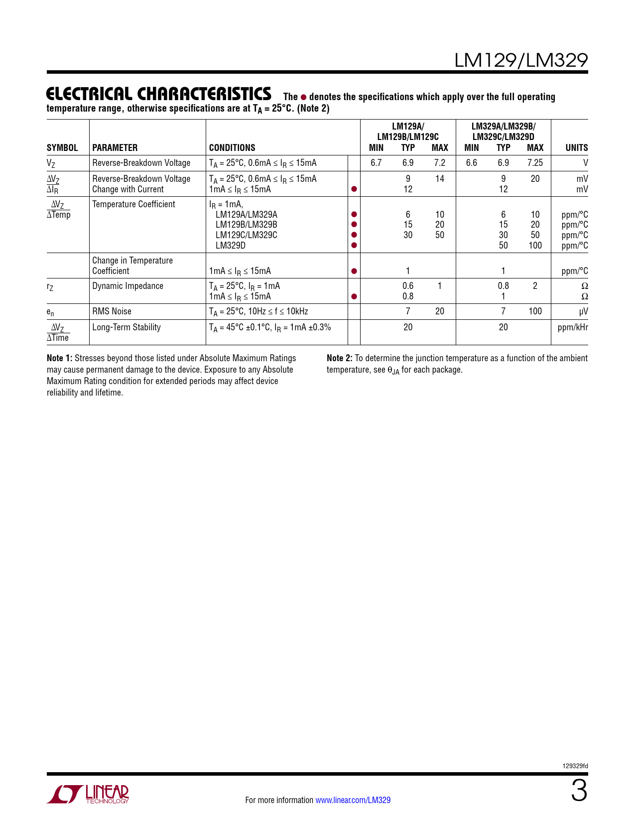 VZ Reverse-Breakdown Voltage TA = 25°C, 0.6mA ≤ IR ≤ 15mA 6.7 6.9 7.2 6.6 6.9 7.25 V ∆VZ Reverse-Breakdown Voltage TA = 25°C, 0.6mA ≤ IR ≤ 15mA 9 14 9 20 mV ∆IR Change with Current 1mA ≤ IR ≤ 15mA l 12 12 mV ∆VZ Temperature Coefficient IR = 1mA, ∆Temp LM129A/LM329A l 6 10 6 10 ppm/°C LM129B/LM329B l 15 20 15 20 ppm/°C LM129C/LM329C l 30 50 30 50 ppm/°C LM329D l 50 100 ppm/°C Change in Temperature Coefficient 1mA ≤ IR ≤ 15mA l 1 1 ppm/°C rZ Dynamic Impedance TA = 25°C, IR = 1mA 0.6 1 0.8 2 Ω 1mA ≤ IR ≤ 15mA l 0.8 1 Ω en RMS Noise TA = 25°C, 10Hz ≤ f ≤ 10kHz 7 20 7 100 µV ∆VZ Long-Term Stability TA = 45°C ±0.1°C, IR = 1mA ±0.3% 20 20 ppm/kHr ∆Time