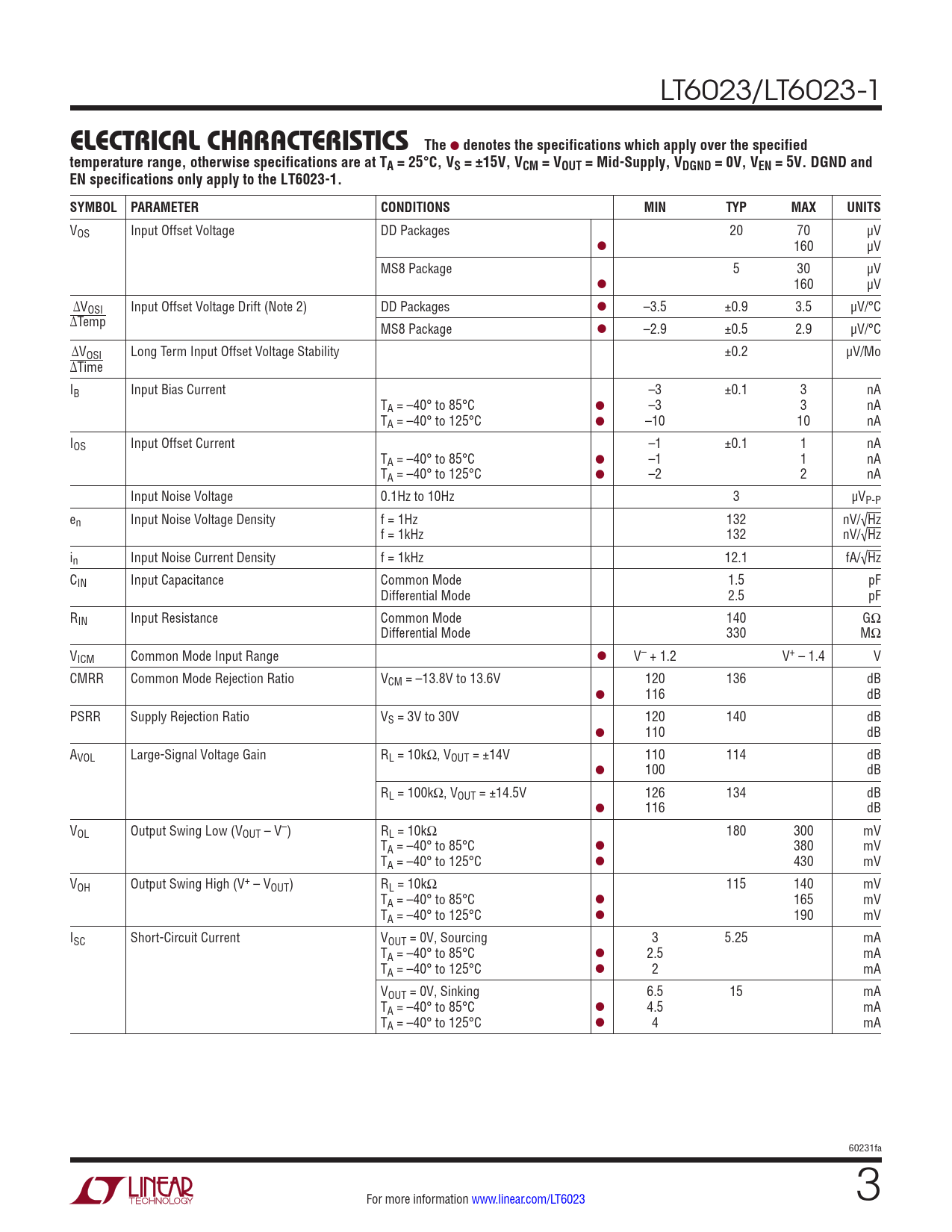 denotes the specifications which apply over the specified temperature range, otherwise specifications are at TA = 25°C, VS = ±15V, VCM = VOUT = Mid-Supply, VDGND = 0V, VEN = 5V. DGND and EN specifications only apply to the LT6023-1. SYMBOL PARAMETER CONDITIONS MIN TYP MAX UNITS